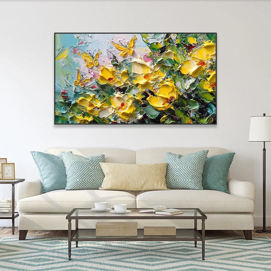 HANDGEZEICHNET Gelbe Blumen und gelbe Schmetterlinge Ölgemälde