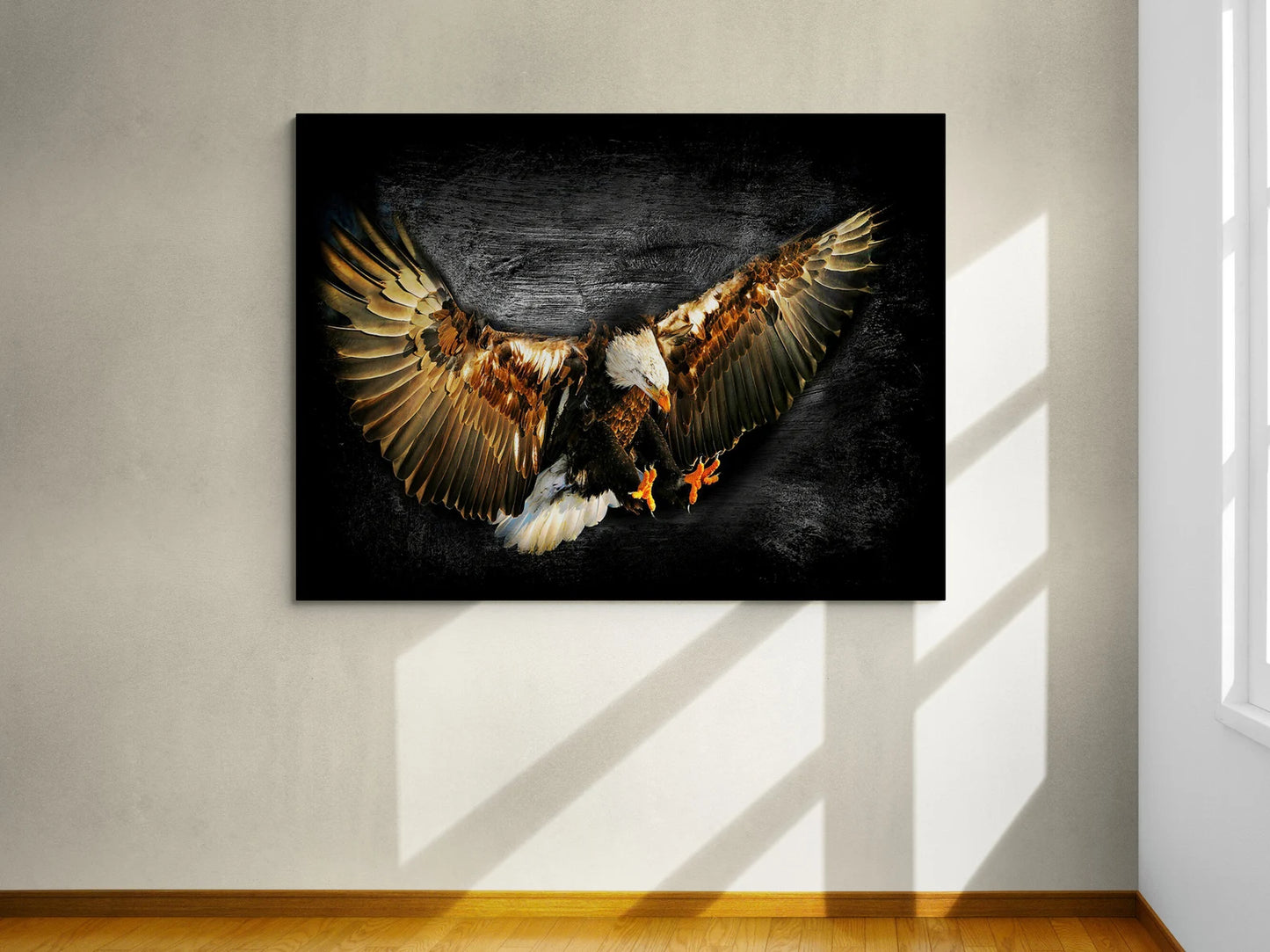 Beautify your home with this eagle in black and gold canvas art picture. This image presents an elegant touch of artistry that will add a pop of beauty to your home! Each product is made with the utmost care and attention to detail after ordering.