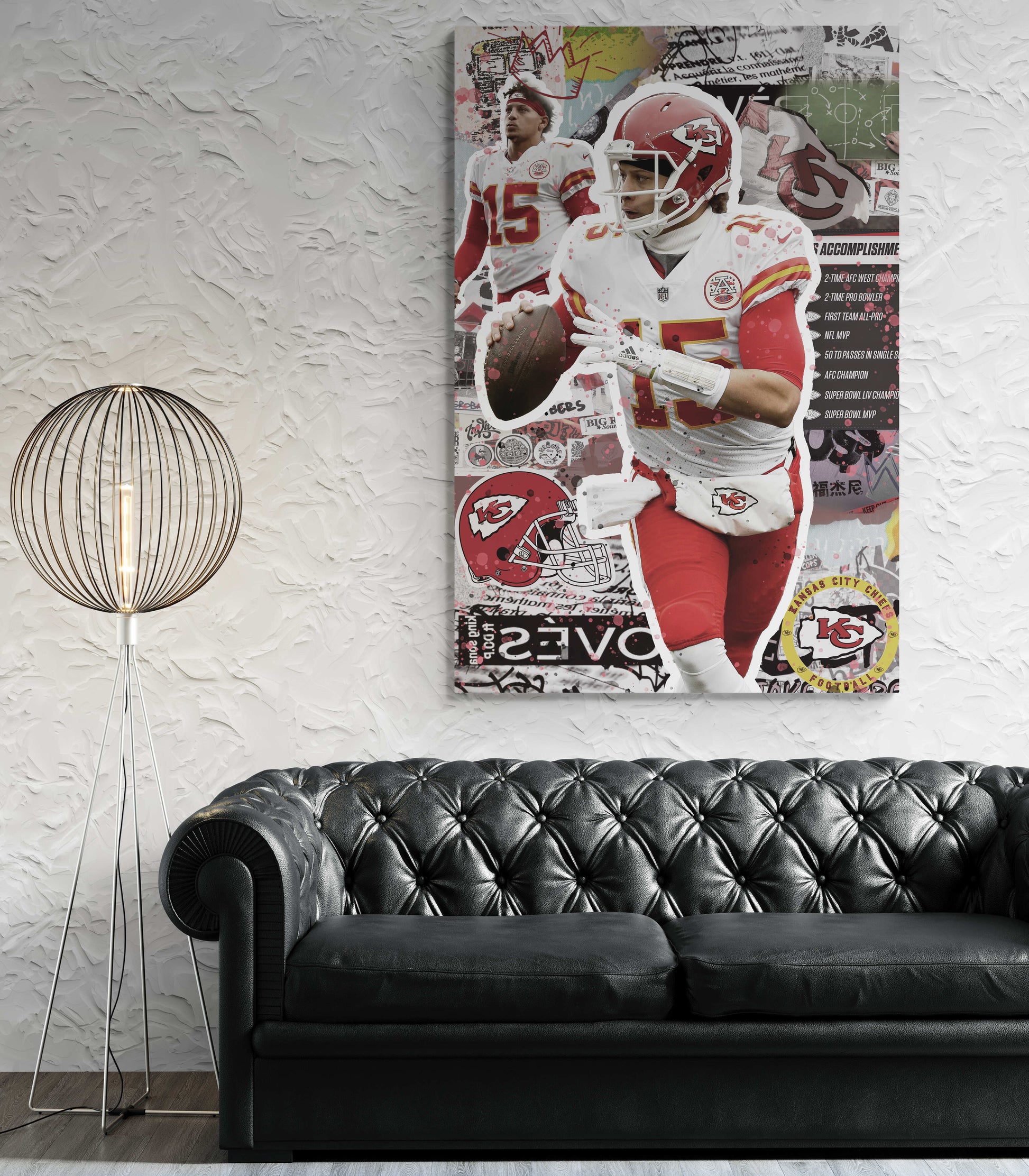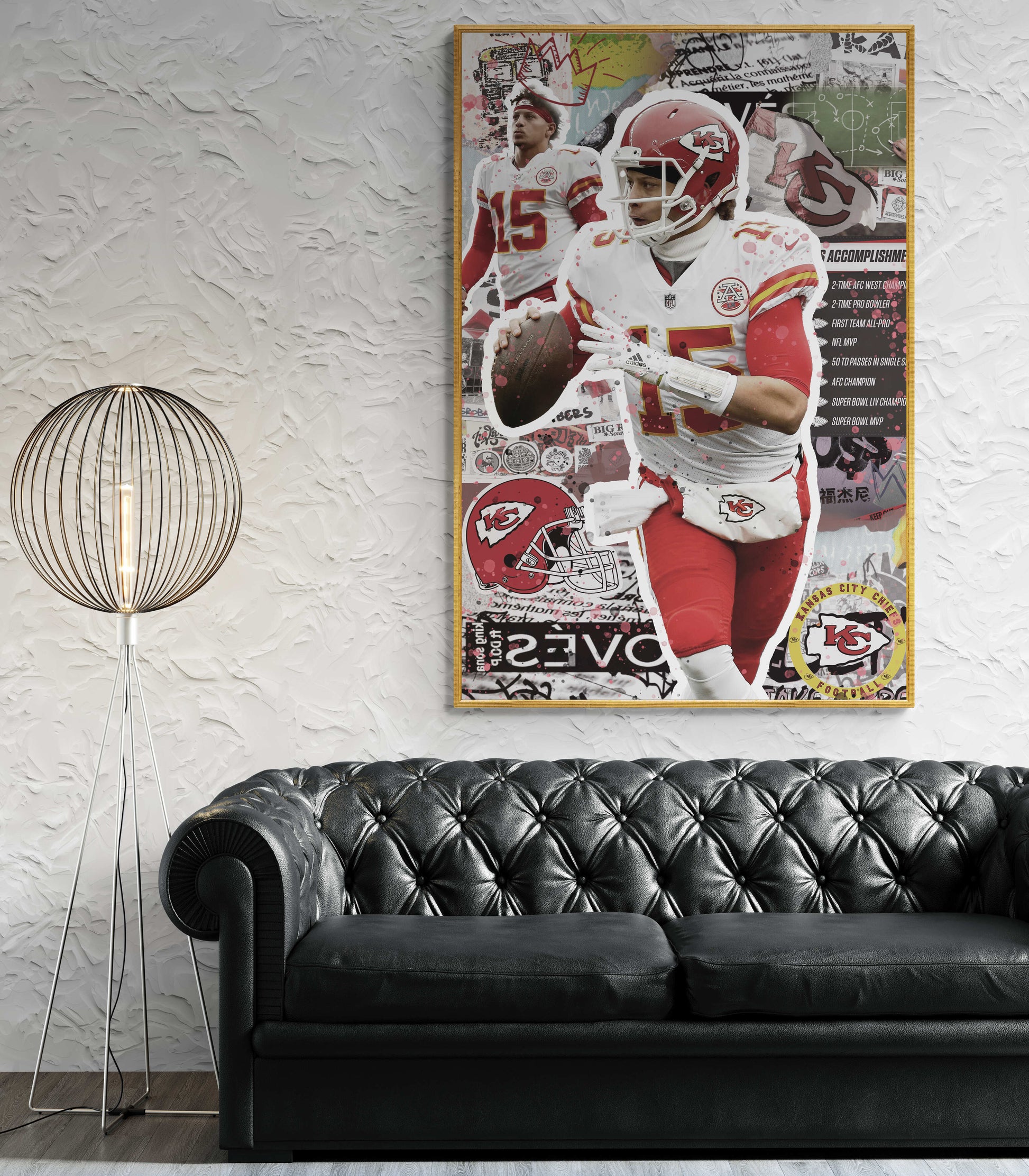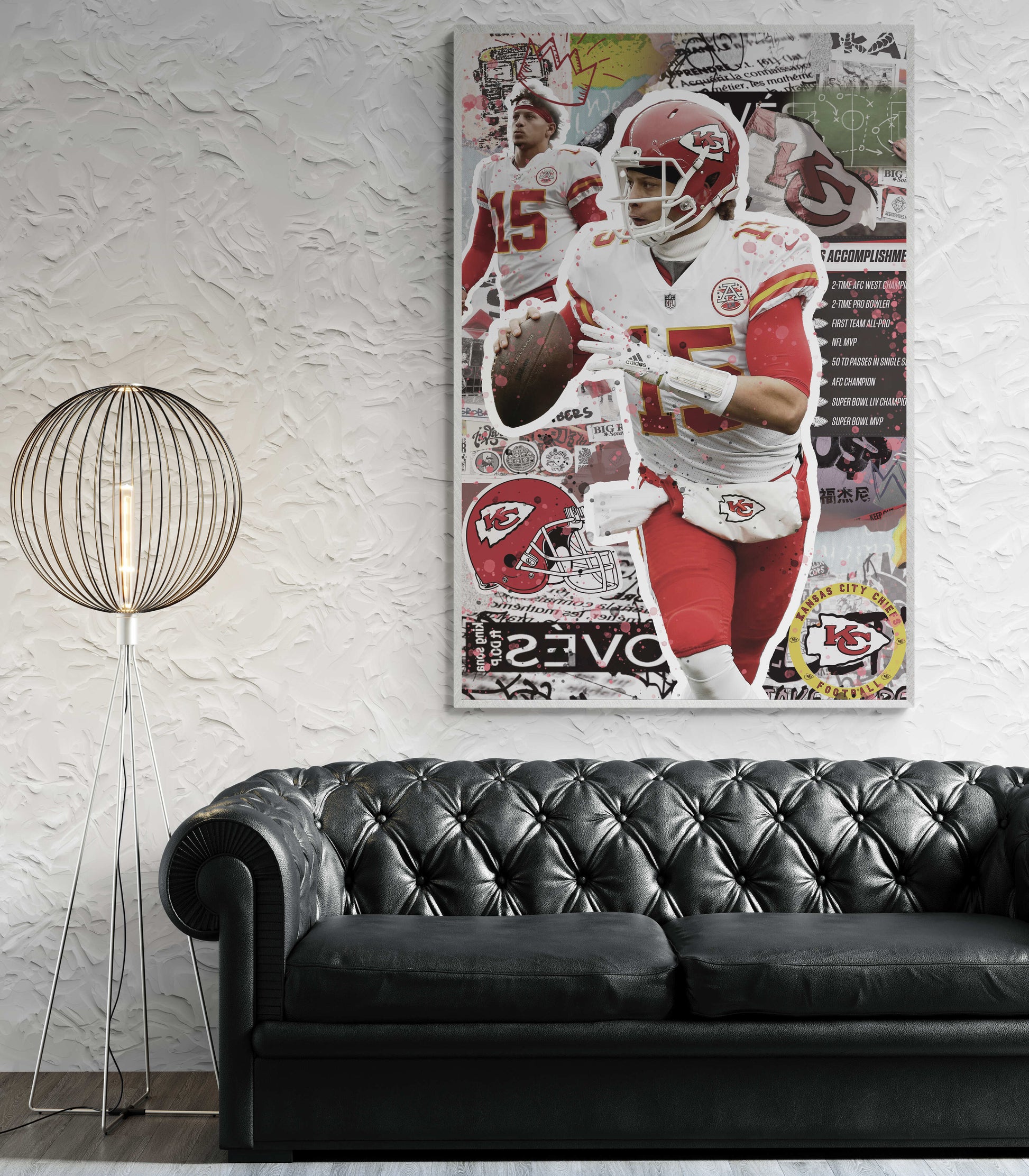 Beautify your home with this POP ART American Football Mahomes. This image presents an elegant touch of artistry that will add a pop of beauty to your home! Each product is made with the utmost care and attention to detail after ordering and is stretched on a canvas or framed upon request.