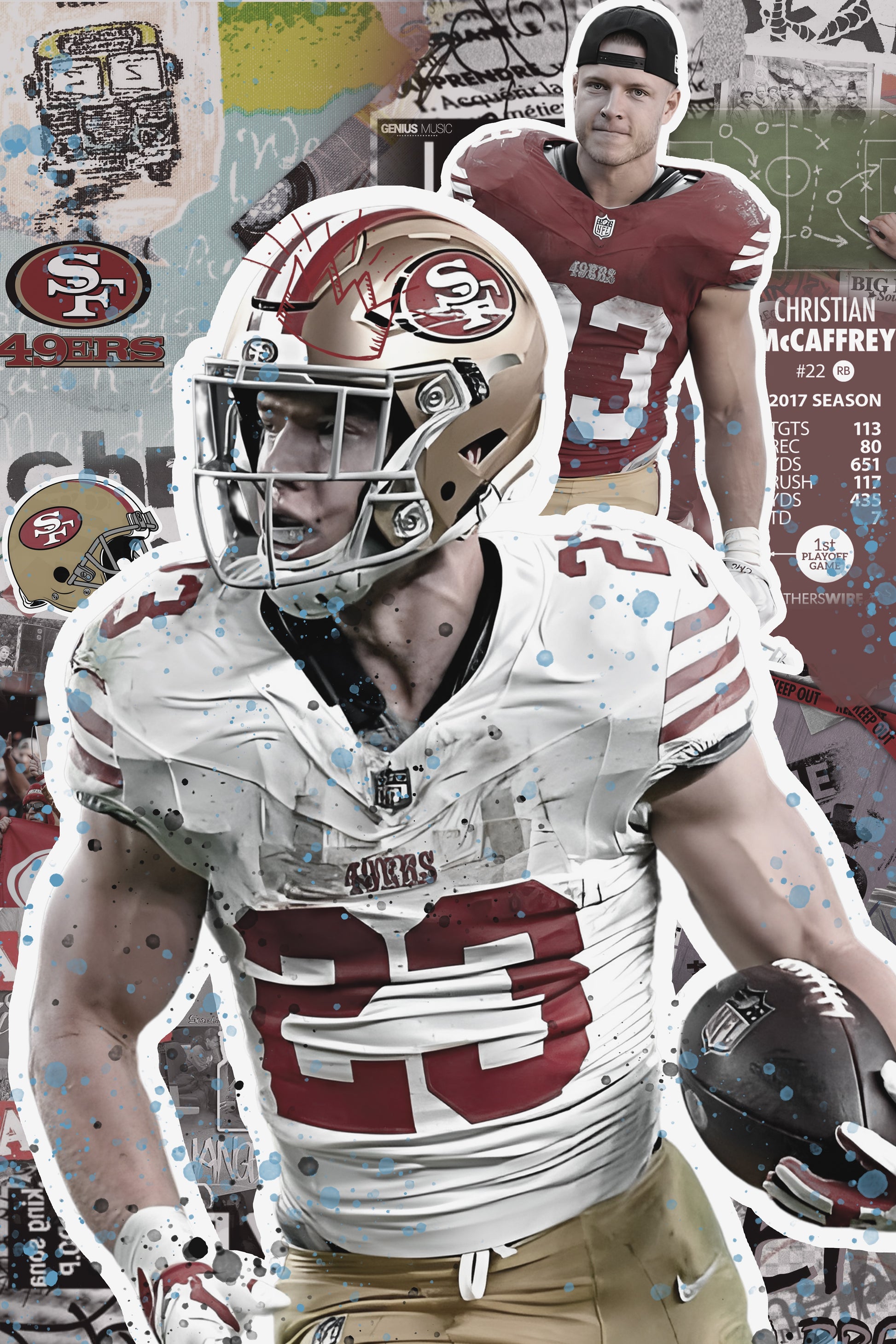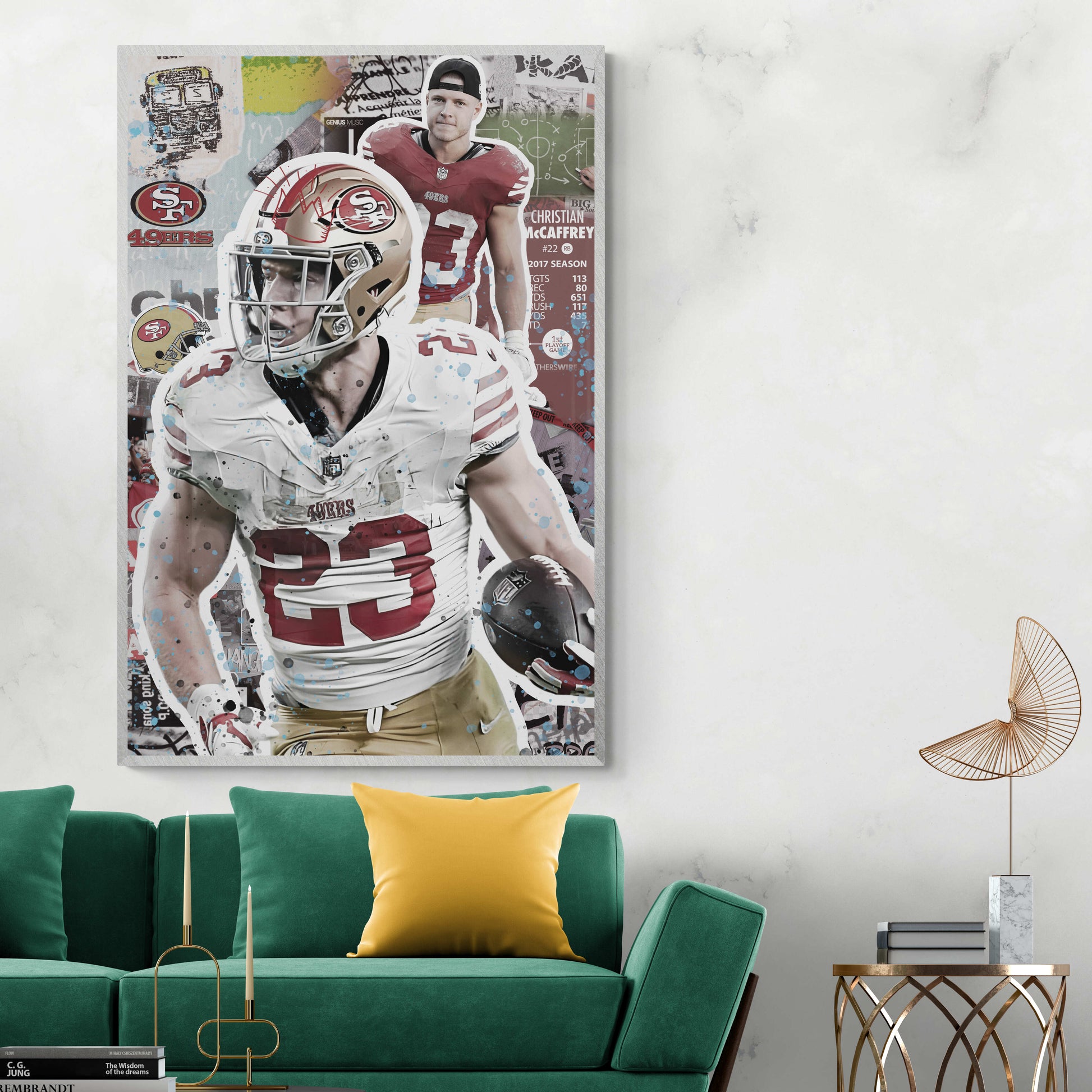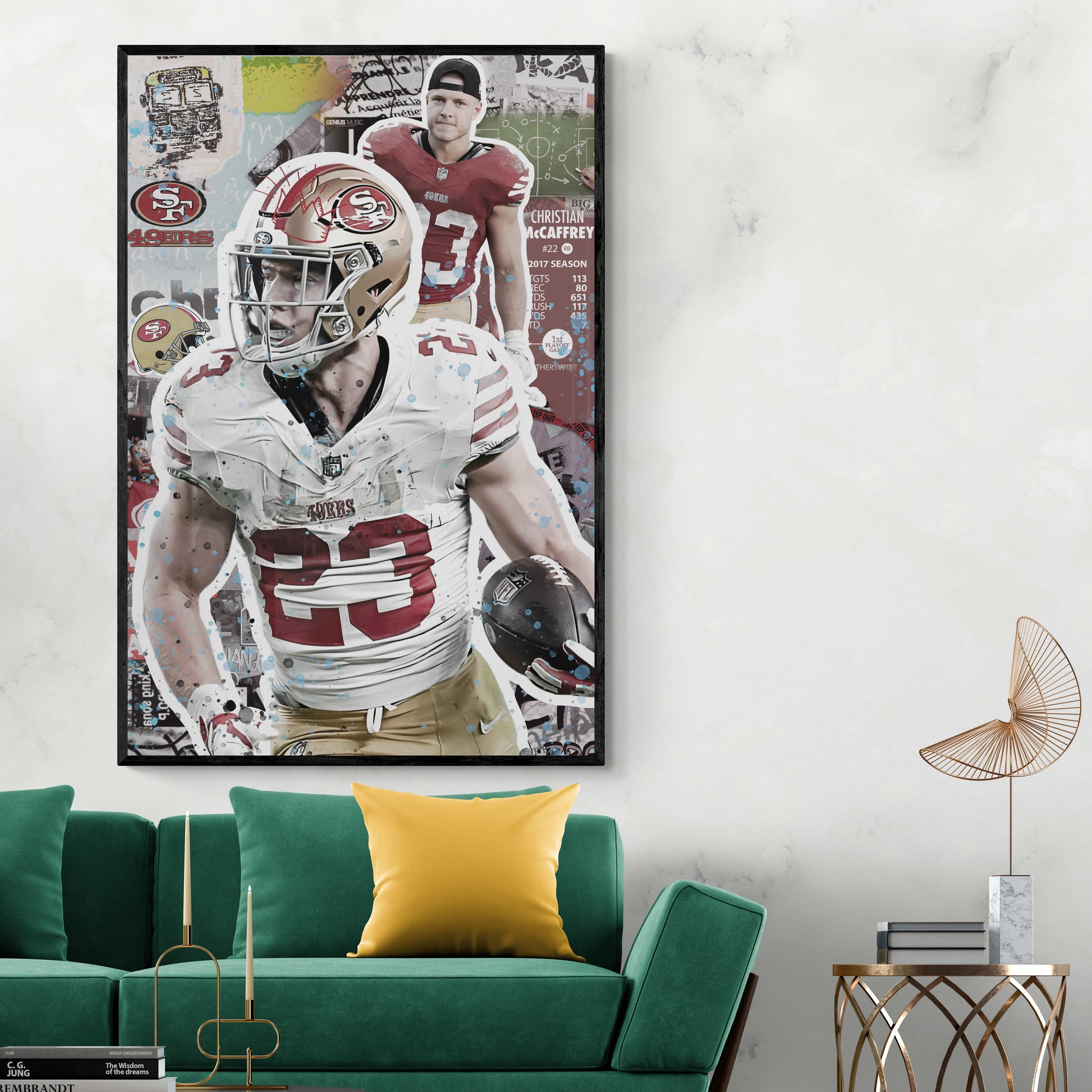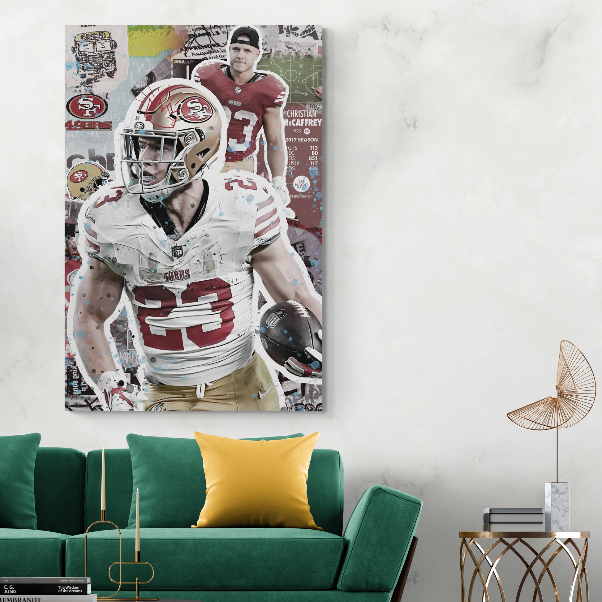 Beautify your home with this POP ART American Football Mc Caffrey. This image presents an elegant touch of artistry that will add a pop of beauty to your home! Each product is made with the utmost care and attention to detail after ordering and is stretched on a canvas or framed upon request.