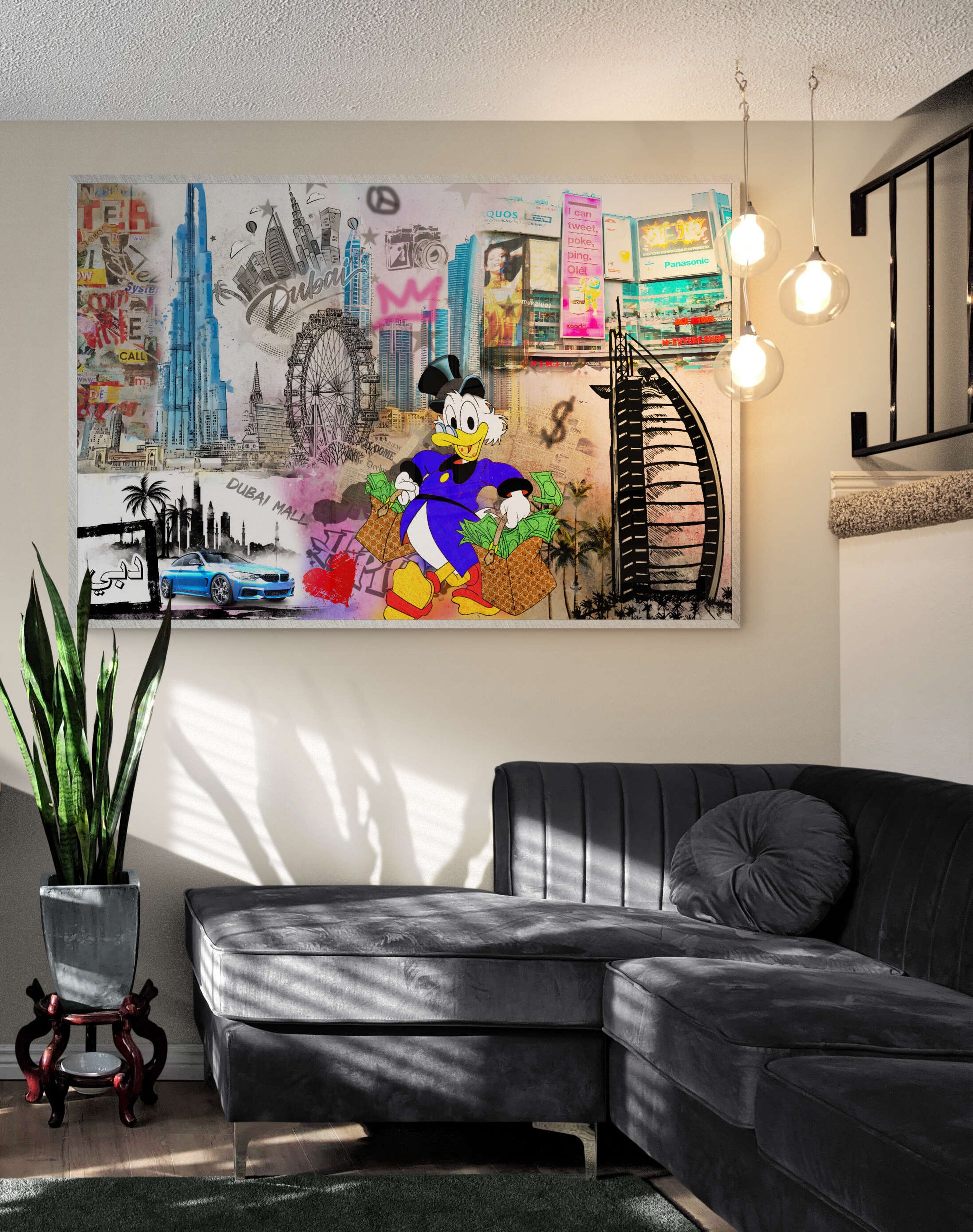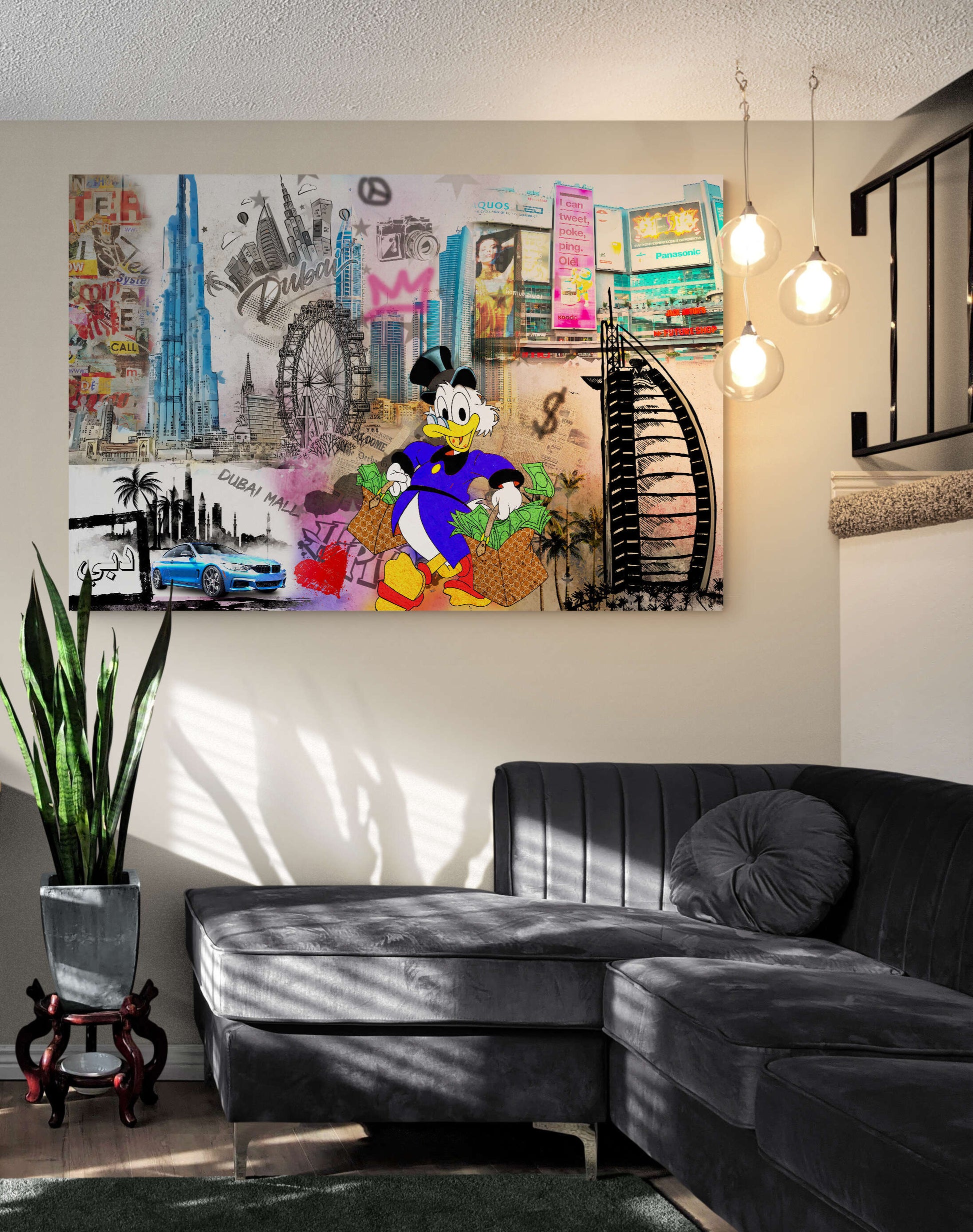 Beautify your home with this POP ART Dubai Money Shopping Edition picture. This image presents an elegant touch of artistry that will add a pop of beauty to your home! Each product is made with the utmost care and attention to detail after ordering and is stretched on a canvas or framed upon request.