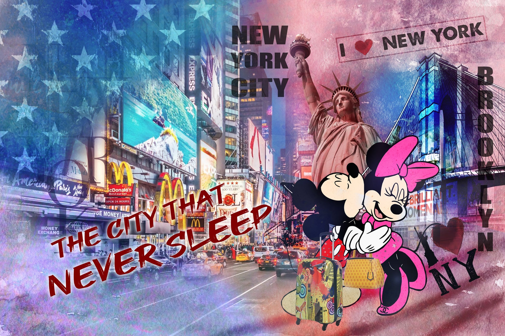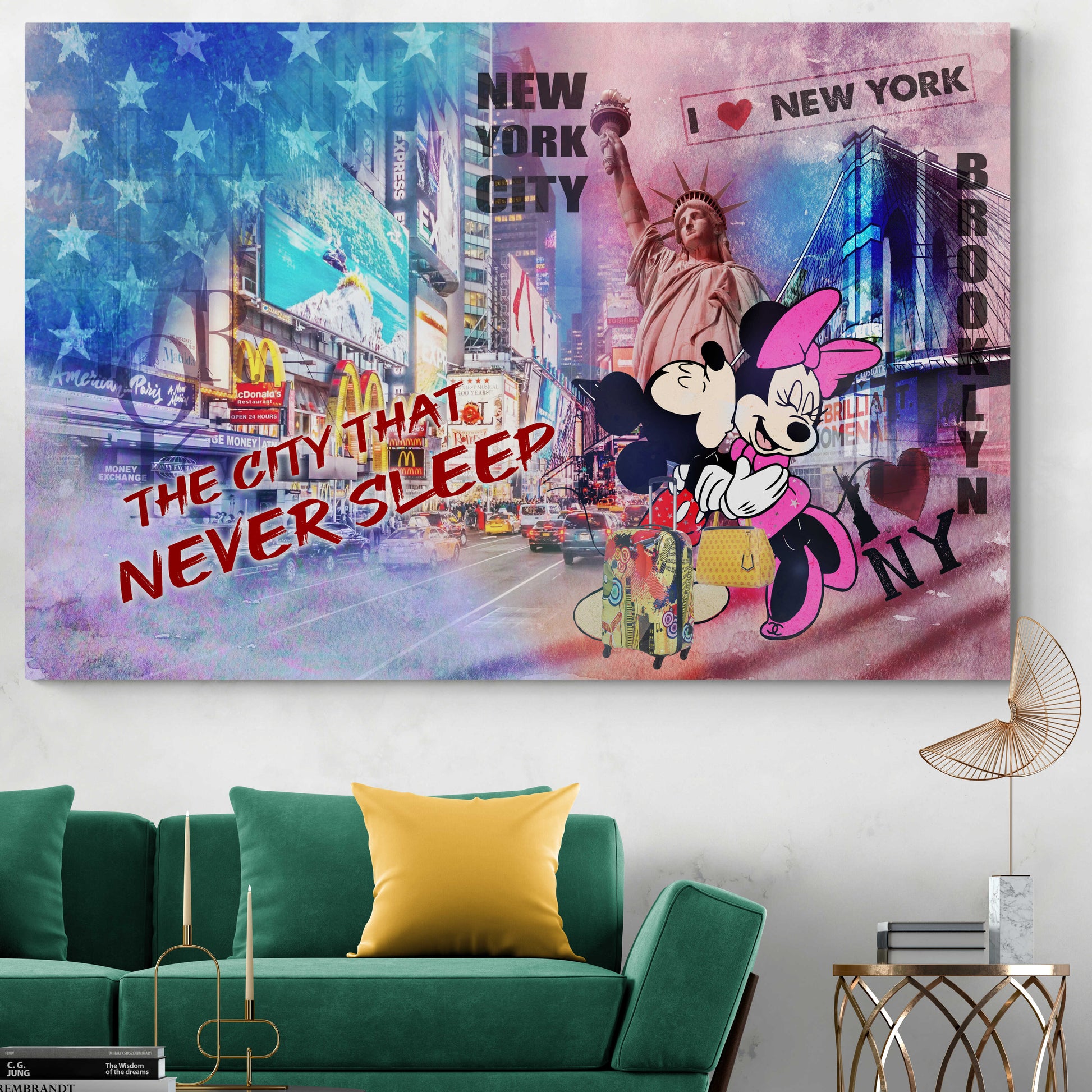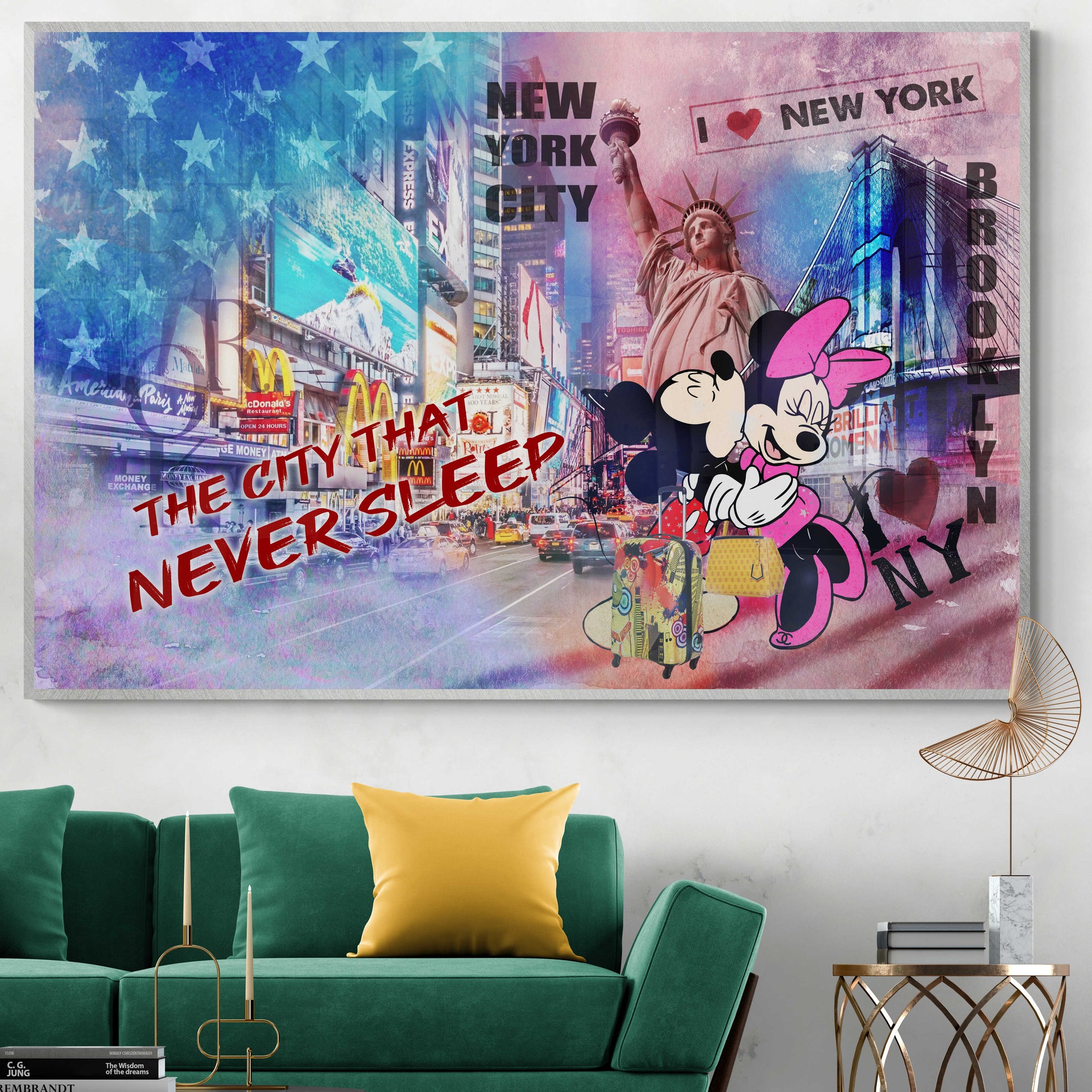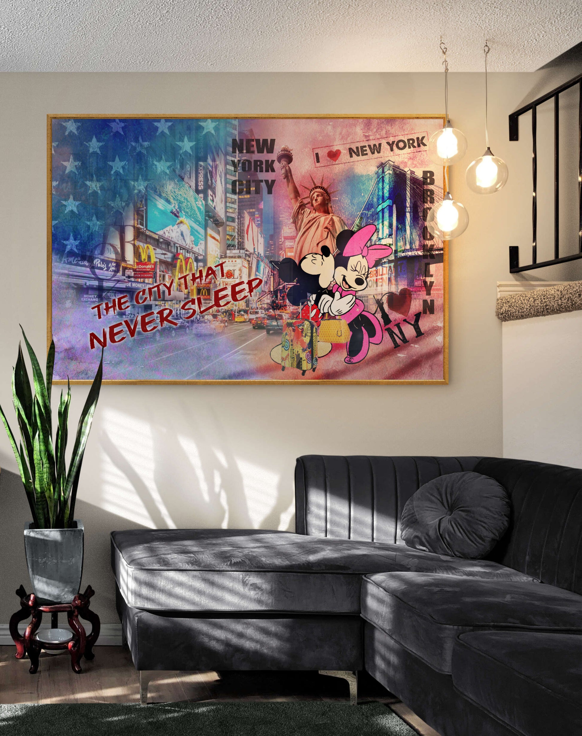 Beautify your home with this POP ART Mickey and Mini in New York picture. This image presents an elegant touch of artistry that will add a pop of beauty to your home! Each product is made with the utmost care and attention to detail after ordering and is stretched on a canvas or framed upon request.