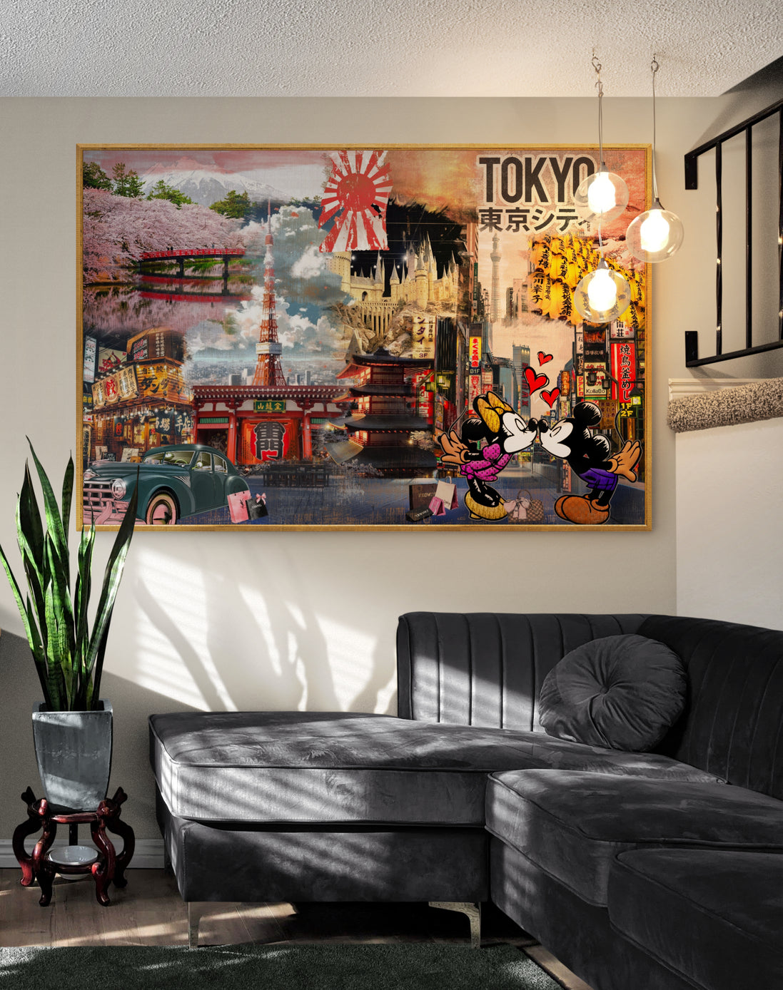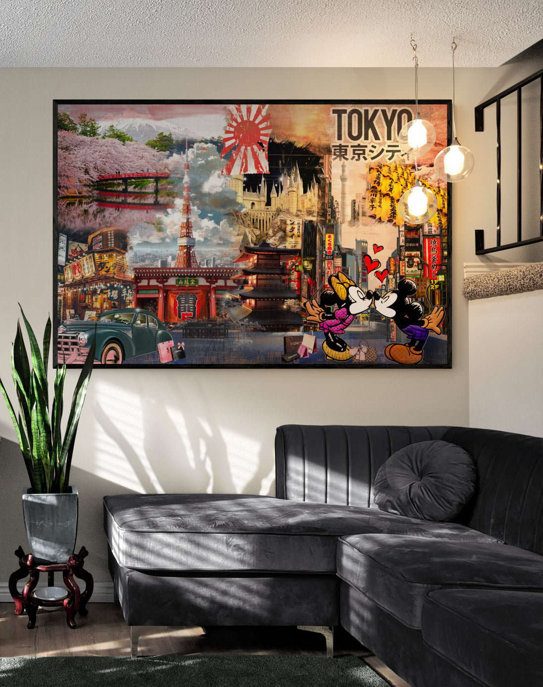 Beautify your home with this POP ART Mickey Kissing Love in Tokyo picture. This image presents an elegant touch of artistry that will add a pop of beauty to your home! Each product is made with the utmost care and attention to detail after ordering and is stretched on a canvas or framed upon request.