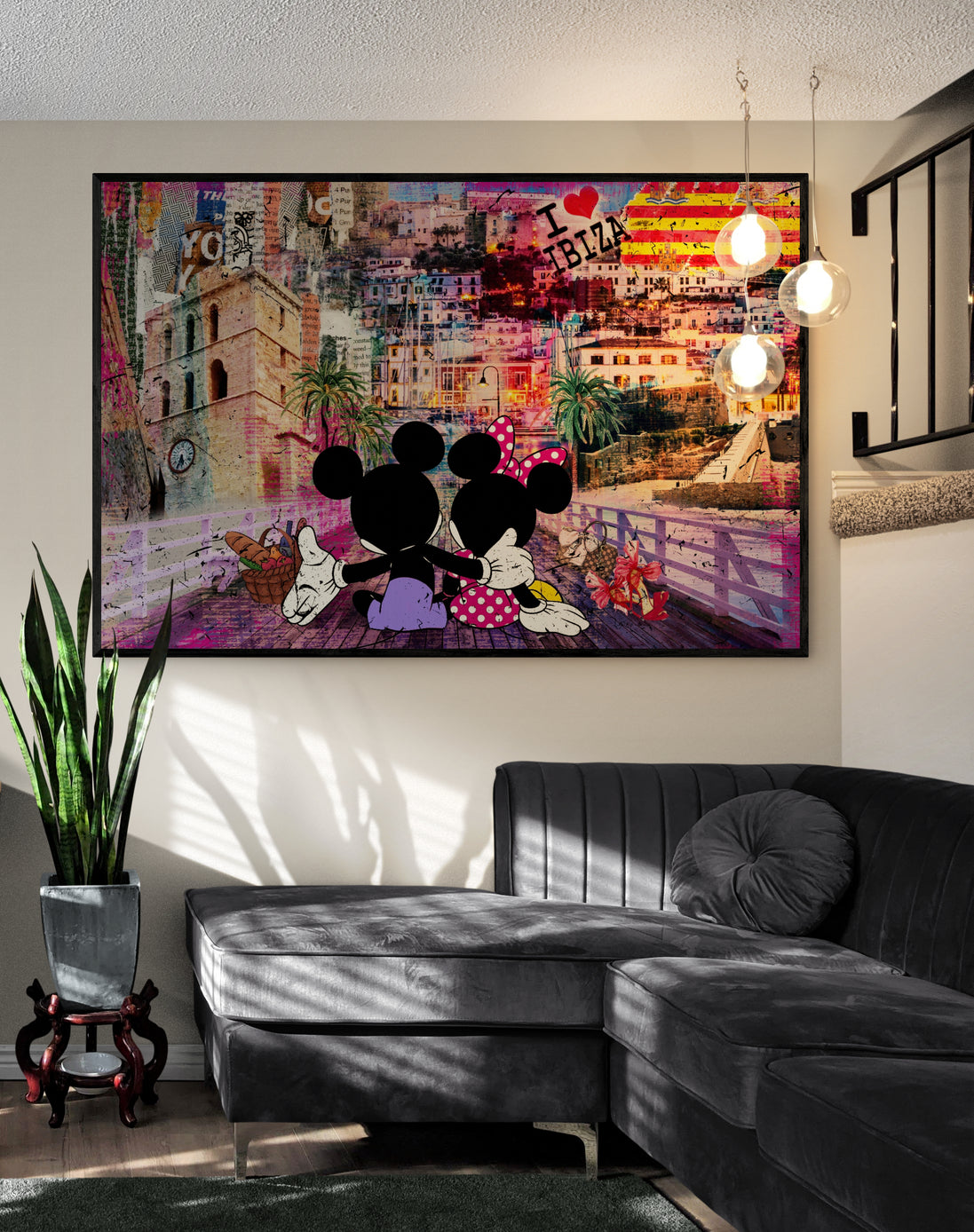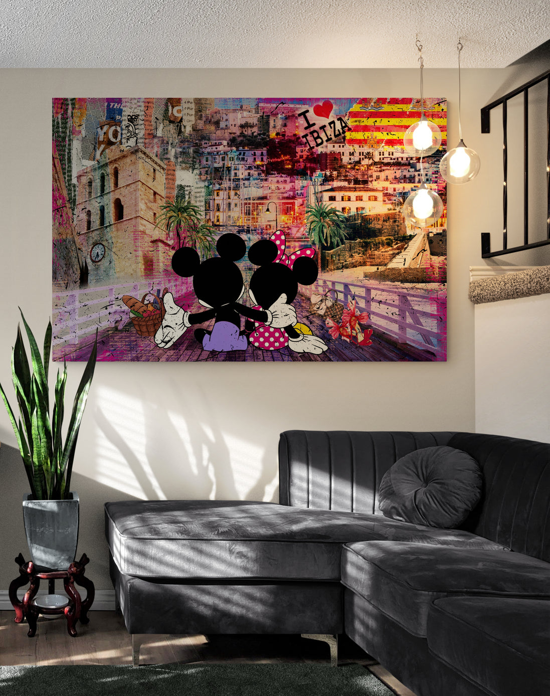 Beautify your home with this POP ART Mickey Love in Ibiza picture. This image presents an elegant touch of artistry that will add a pop of beauty to your home! Each product is made with the utmost care and attention to detail after ordering and is stretched on a canvas or framed upon request.