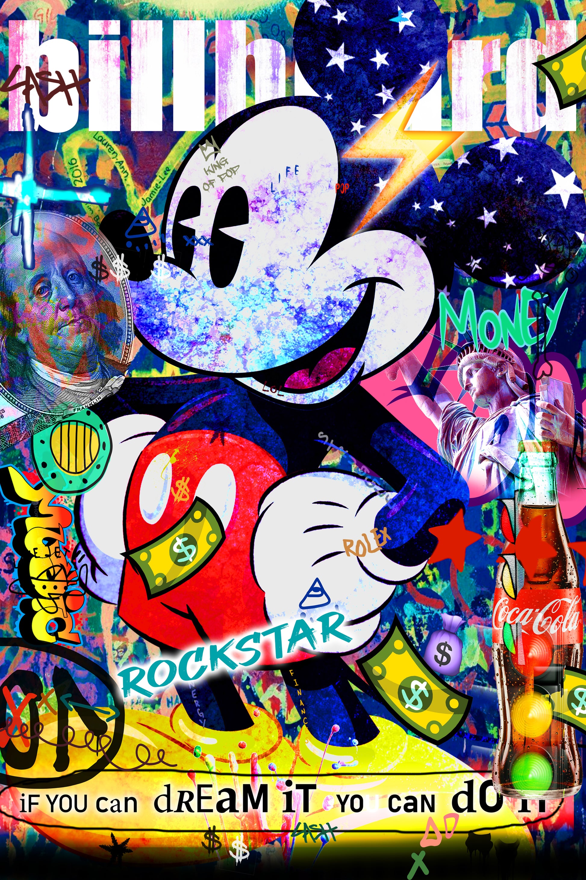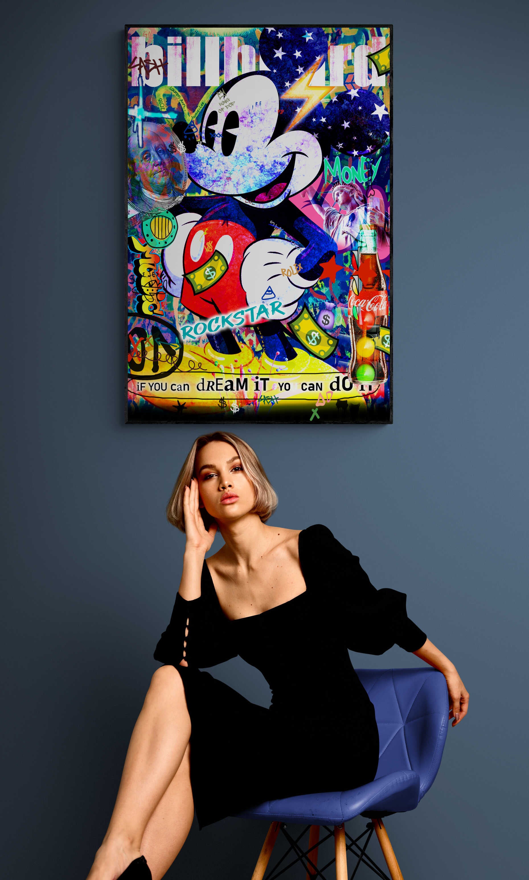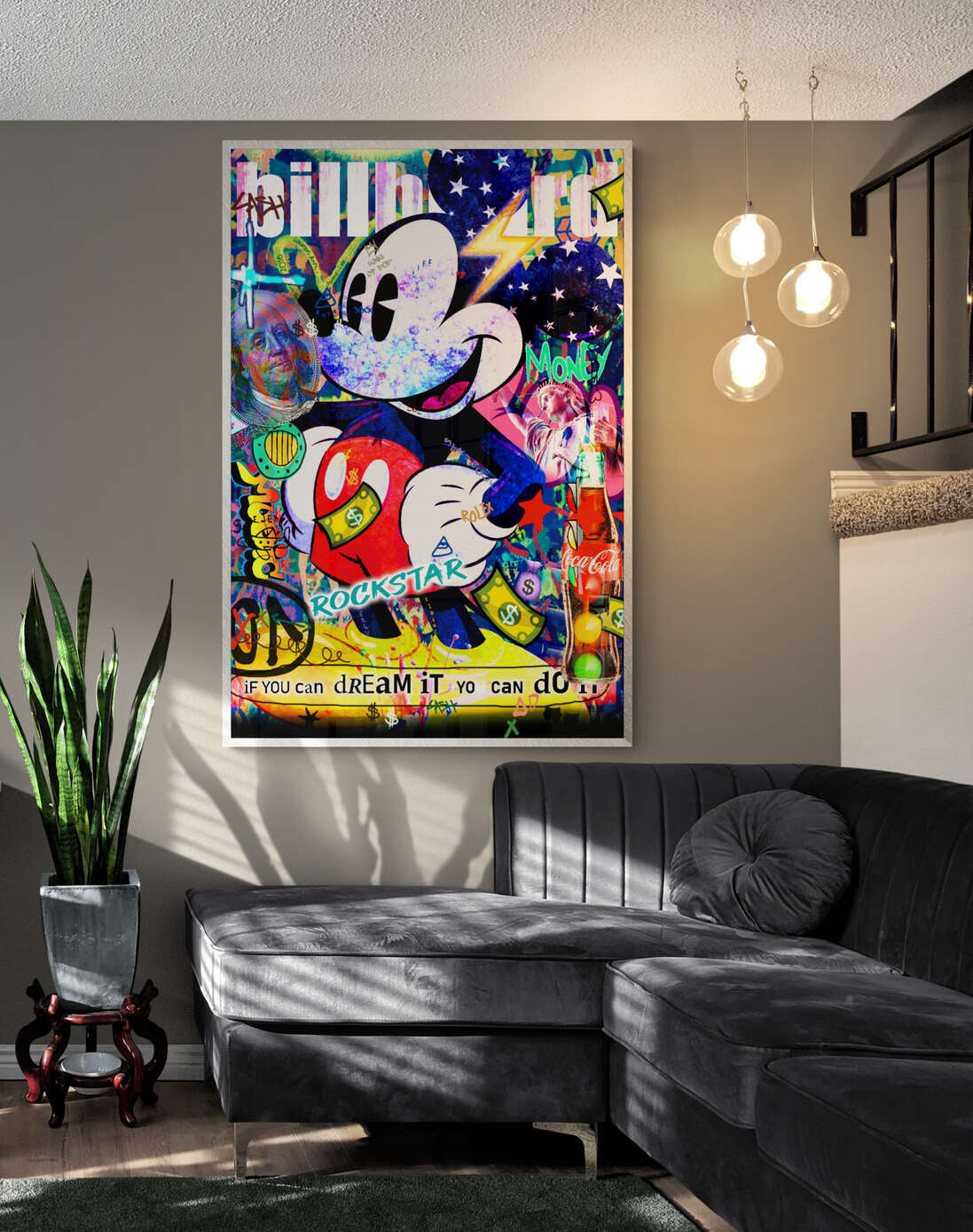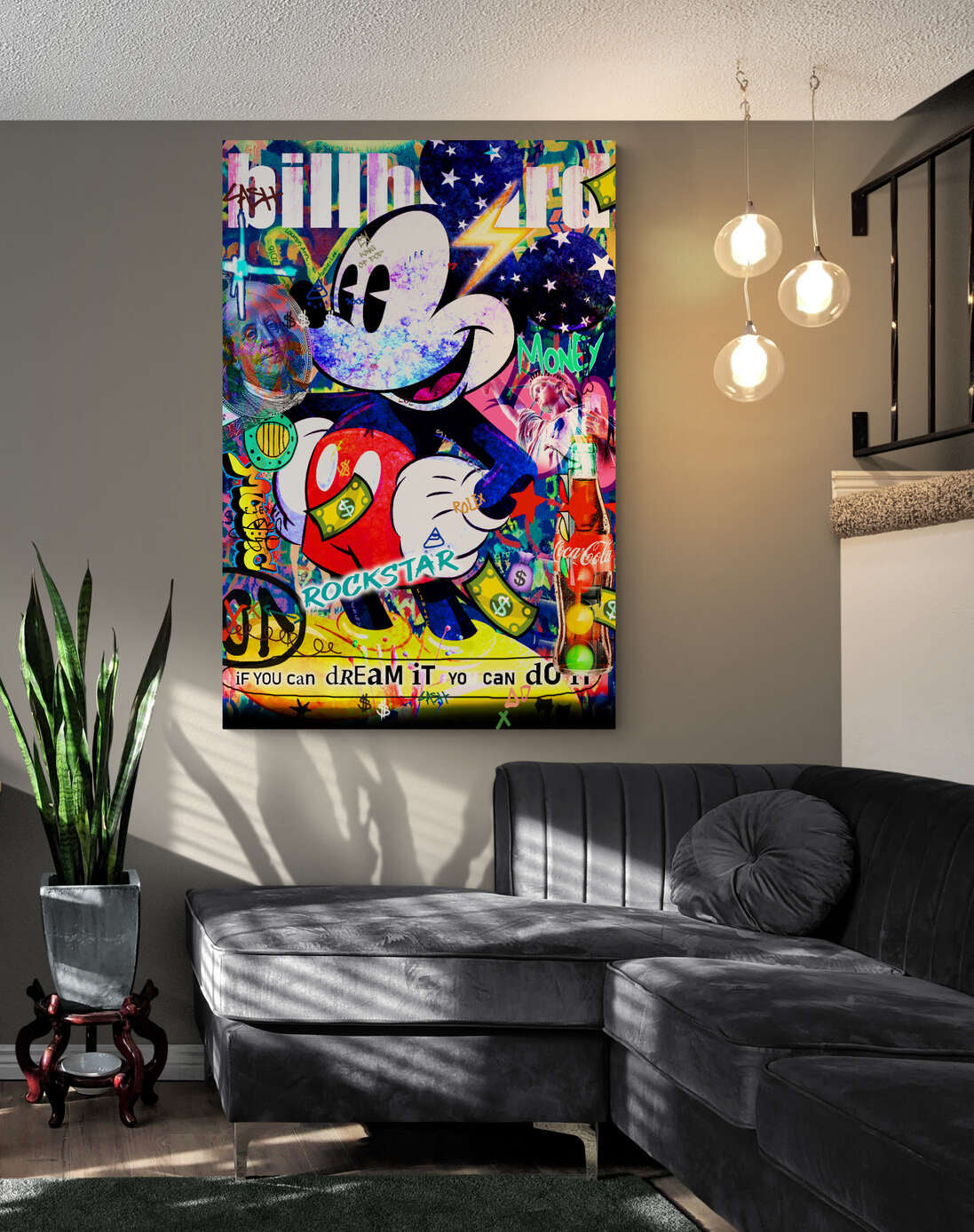 Beautify your home with this POP ART Mickey Rockstar USA picture. This image presents an elegant touch of artistry that will add a pop of beauty to your home! Each product is made with the utmost care and attention to detail after ordering and is stretched on a canvas or framed upon request.