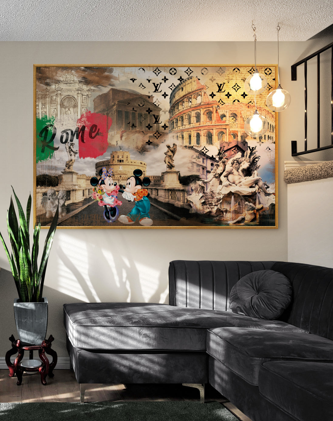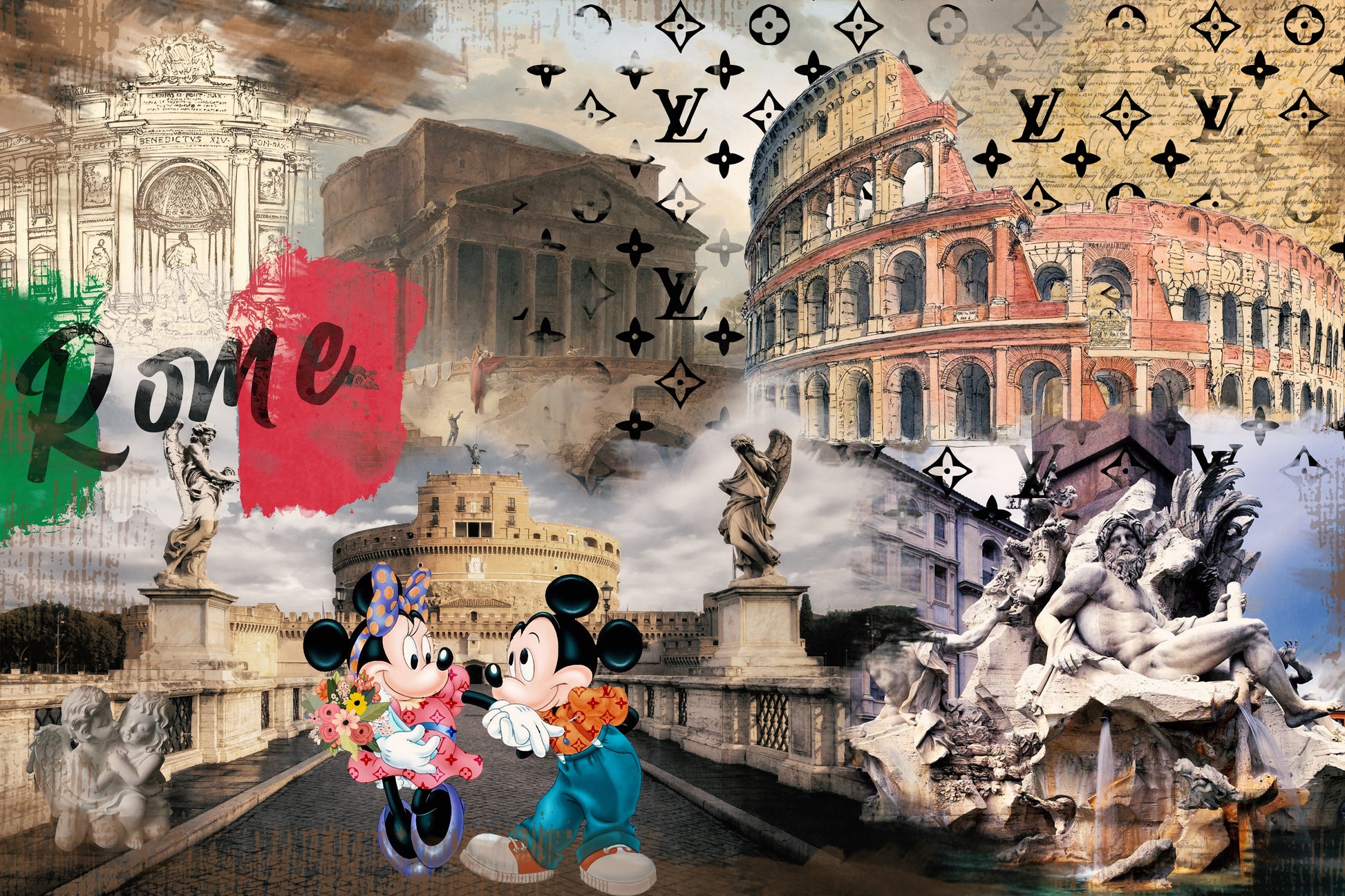 Beautify your home with this POP ART Rome Mickey Love picture. This image presents an elegant touch of artistry that will add a pop of beauty to your home! Each product is made with the utmost care and attention to detail after ordering and is stretched on a canvas or framed upon request.
