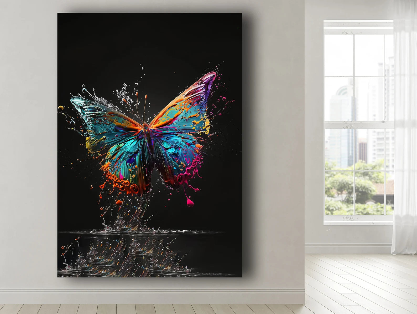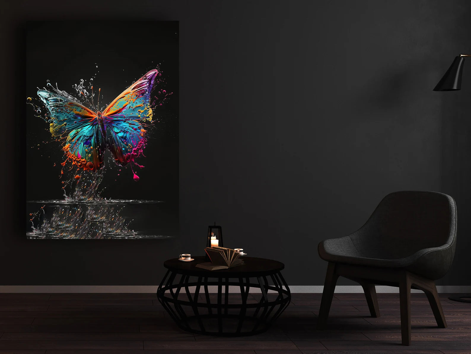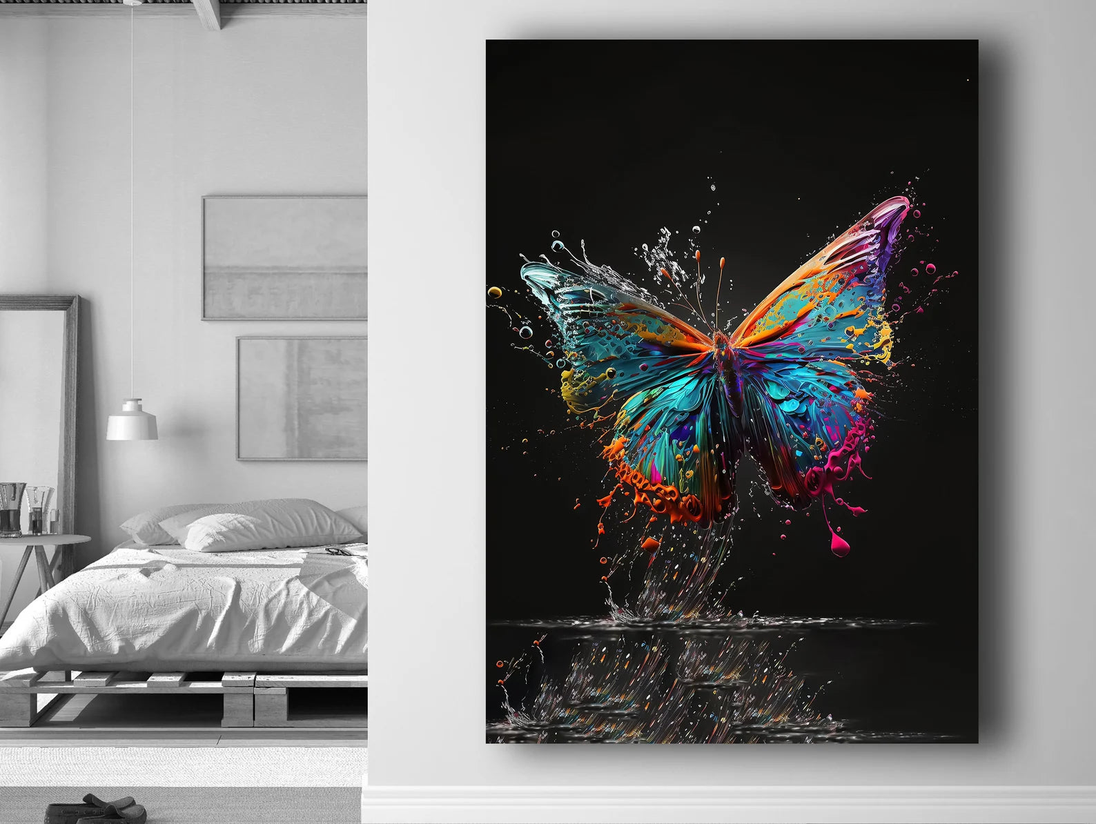 Abbellisci la tua casa con questa farfalla colorata su immagine nera. Questa immagine presenta un elegante tocco di artigianalità che aggiungerà un tocco di bellezza alla tua casa! Ogni prodotto è realizzato con la massima cura e attenzione ai dettagli dopo l'ordine e viene teso su tela o in un quadro.
