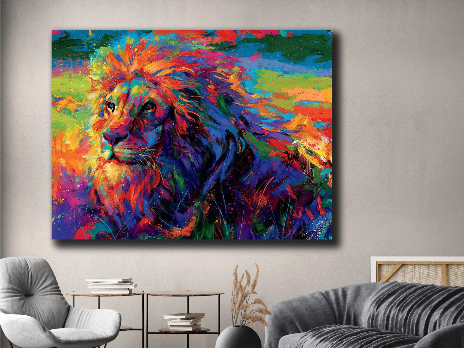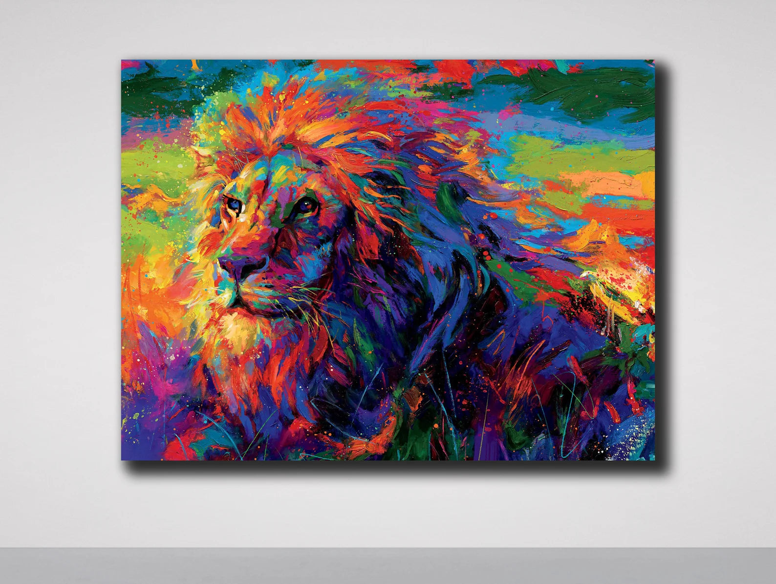 Arricchisci la tua casa con questa immagine artistica su tela colorata e fiera del leone. Questa immagine presenta un elegante tocco di artigianalità che aggiungerà un tocco di bellezza alla tua casa! Ogni prodotto è realizzato con la massima cura e attenzione ai dettagli dopo l'ordine e viene teso su tela o in un quadro.