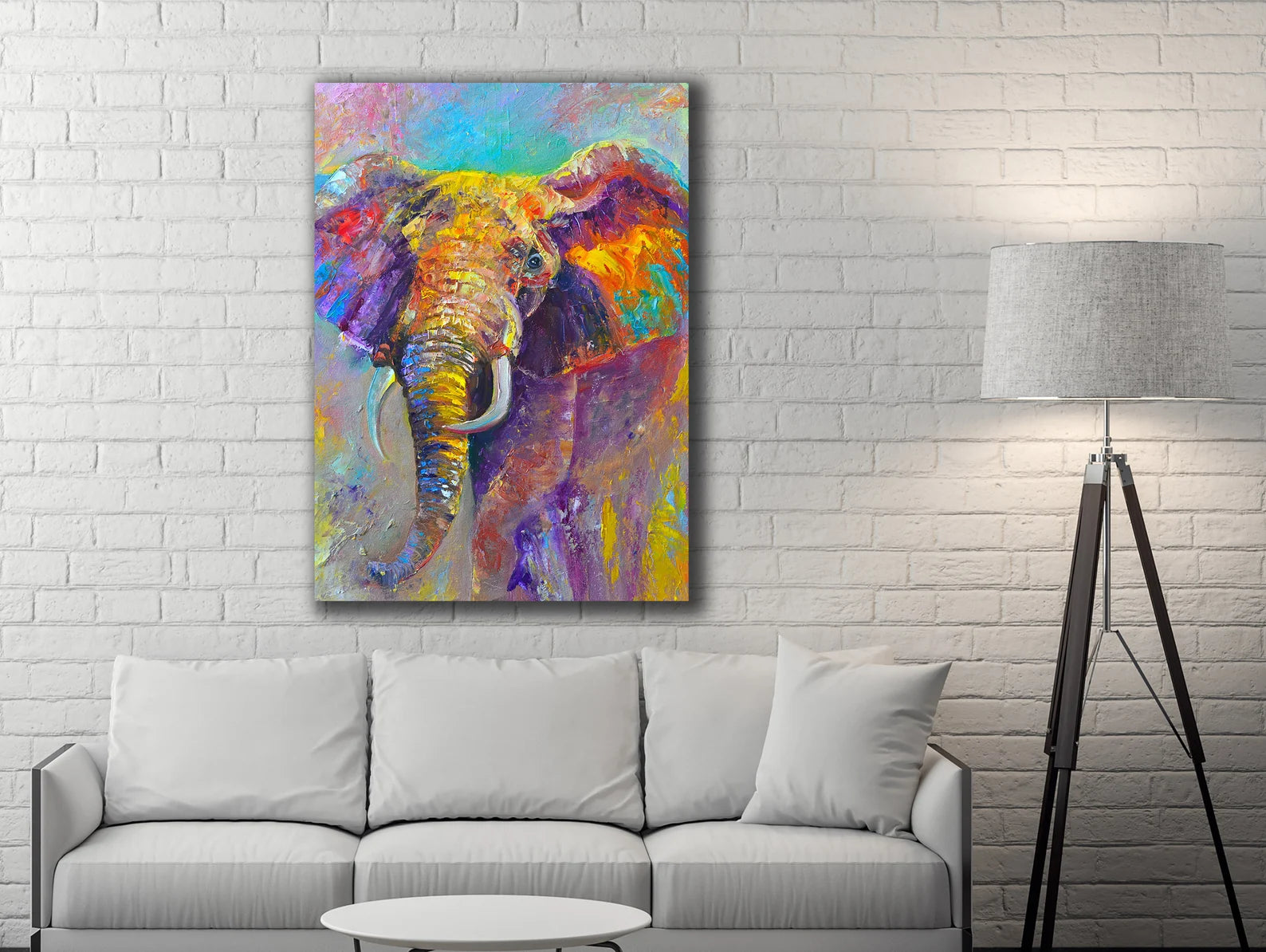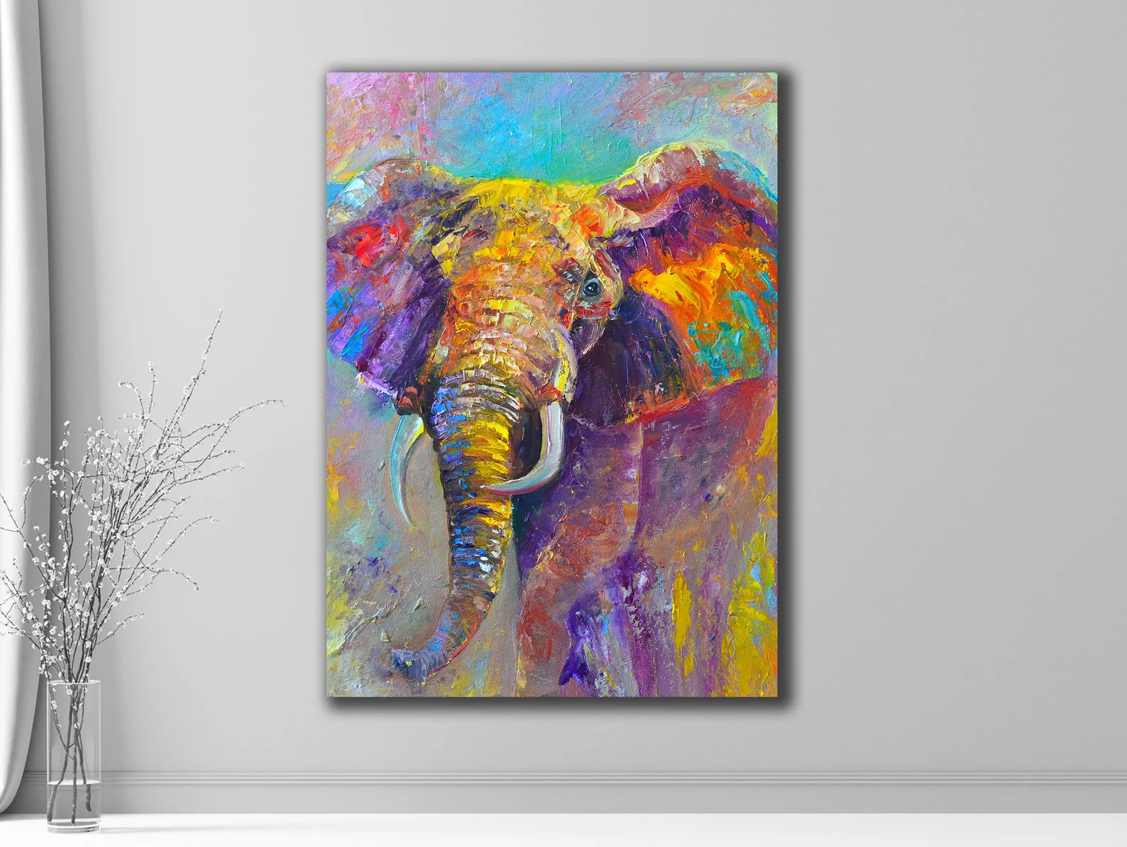 Arricchisci la tua casa con questo quadro su tela con elefante a colori. Questa immagine presenta un elegante tocco di artigianalità che aggiungerà un tocco di bellezza alla tua casa! Ogni prodotto è realizzato con la massima cura e attenzione ai dettagli dopo l'ordine e viene teso su tela o in un quadro.