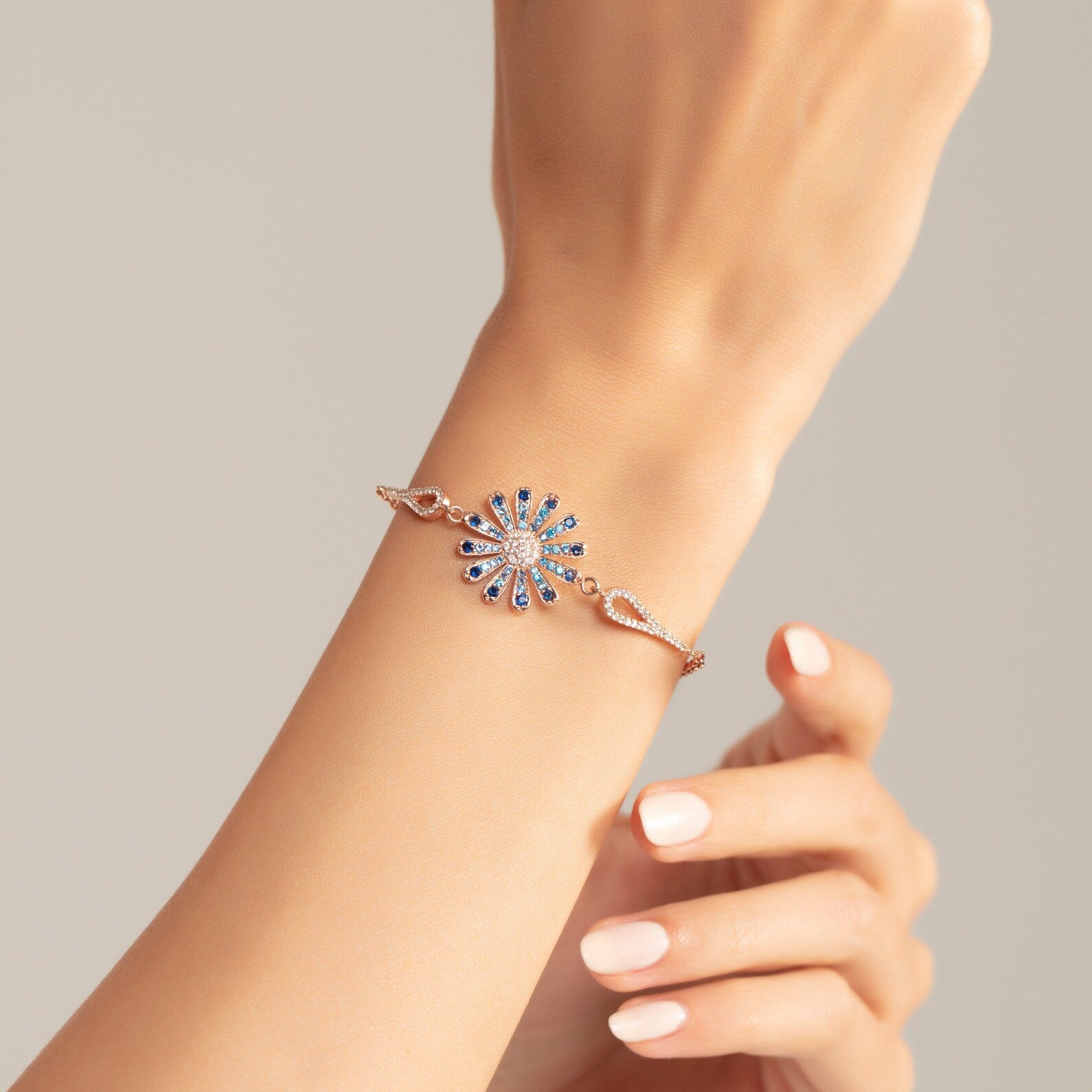 Dieses Blue Daisy Zirkonia Armband wird alle Blicke auf sich ziehen. Wenn Sie diese Halskette bestellen, wird es direkt nach Bestelleingang von Hand für Sie produziert.