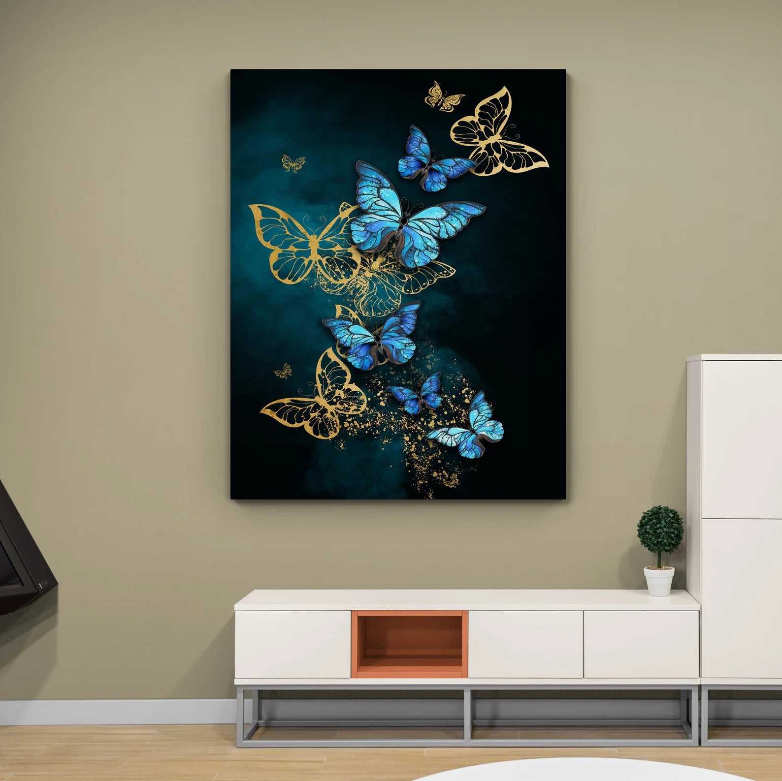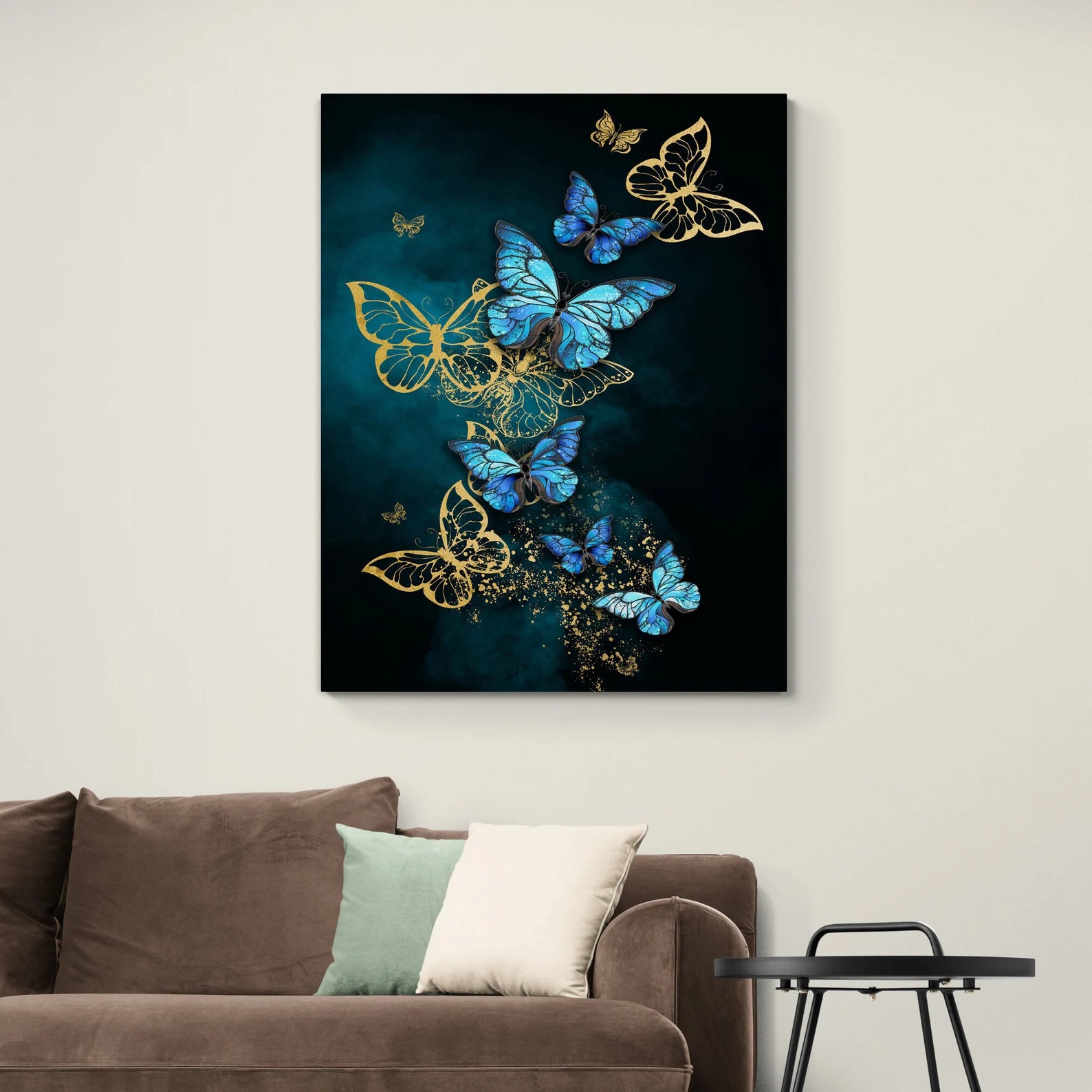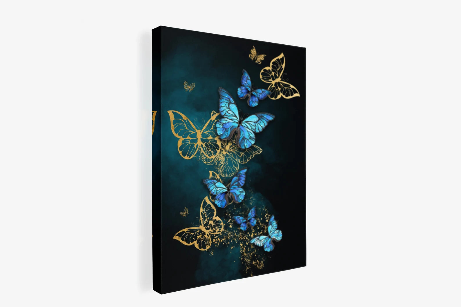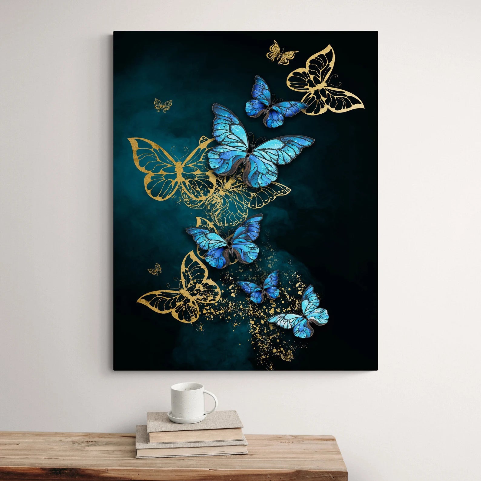 Arricchisci la tua casa con questo quadro su tela farfalla blu e oro. Questa immagine presenta un elegante tocco di artigianalità che aggiungerà un tocco di bellezza alla tua casa! Ogni prodotto è realizzato con la massima cura e attenzione ai dettagli dopo l'ordine e viene teso su tela o in un quadro.