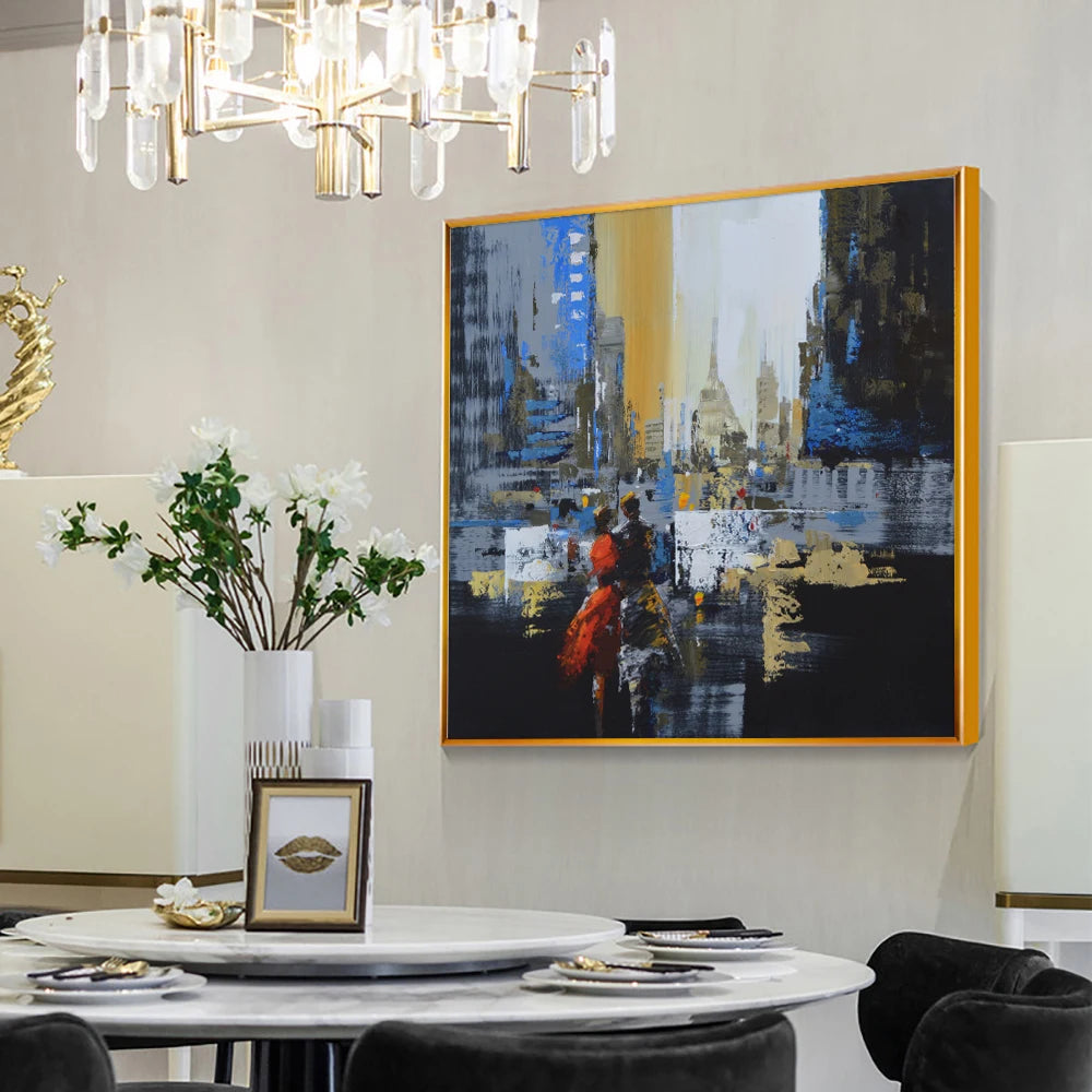 HANDGEZEICHNET Liebes Paar in Stadt Ölgemälde