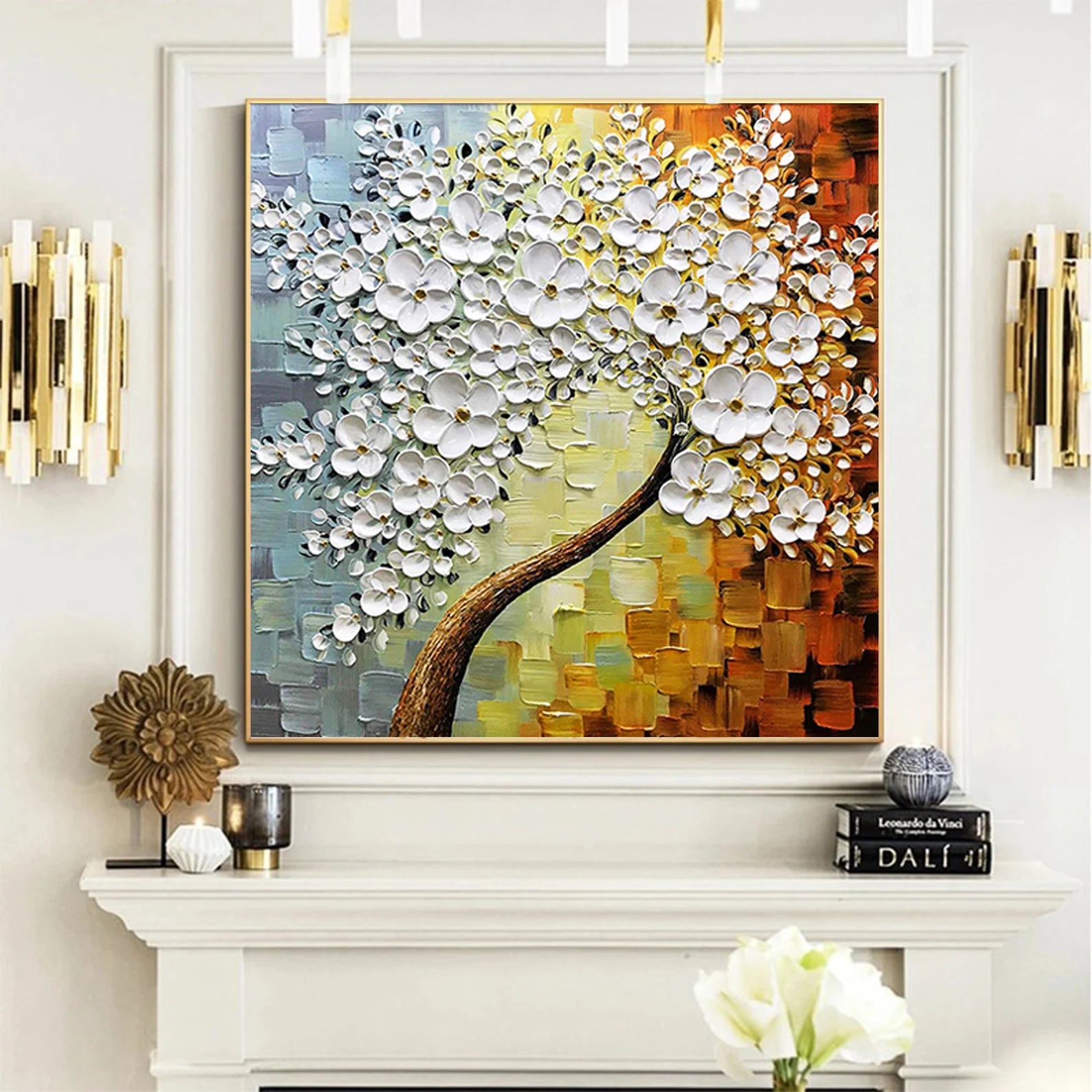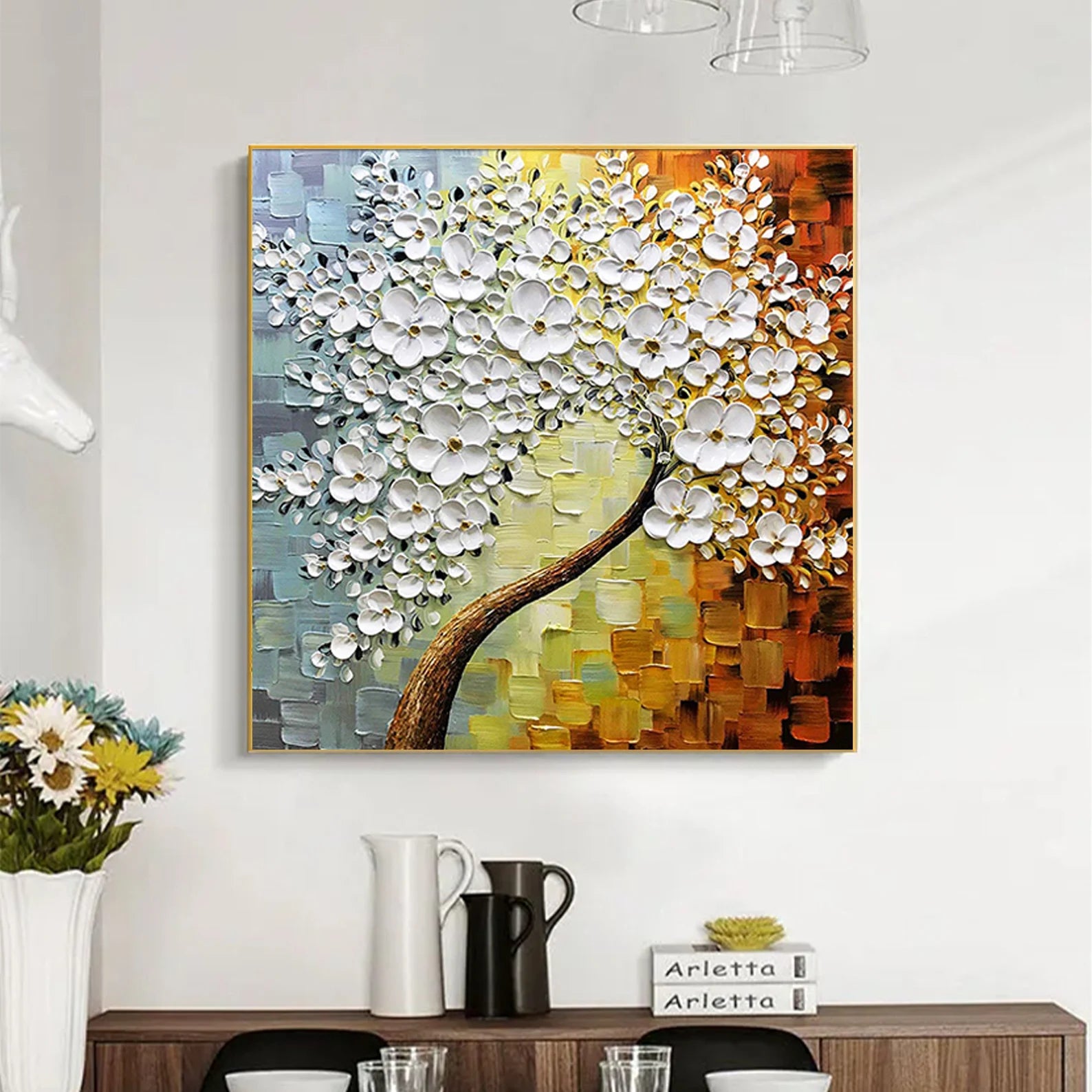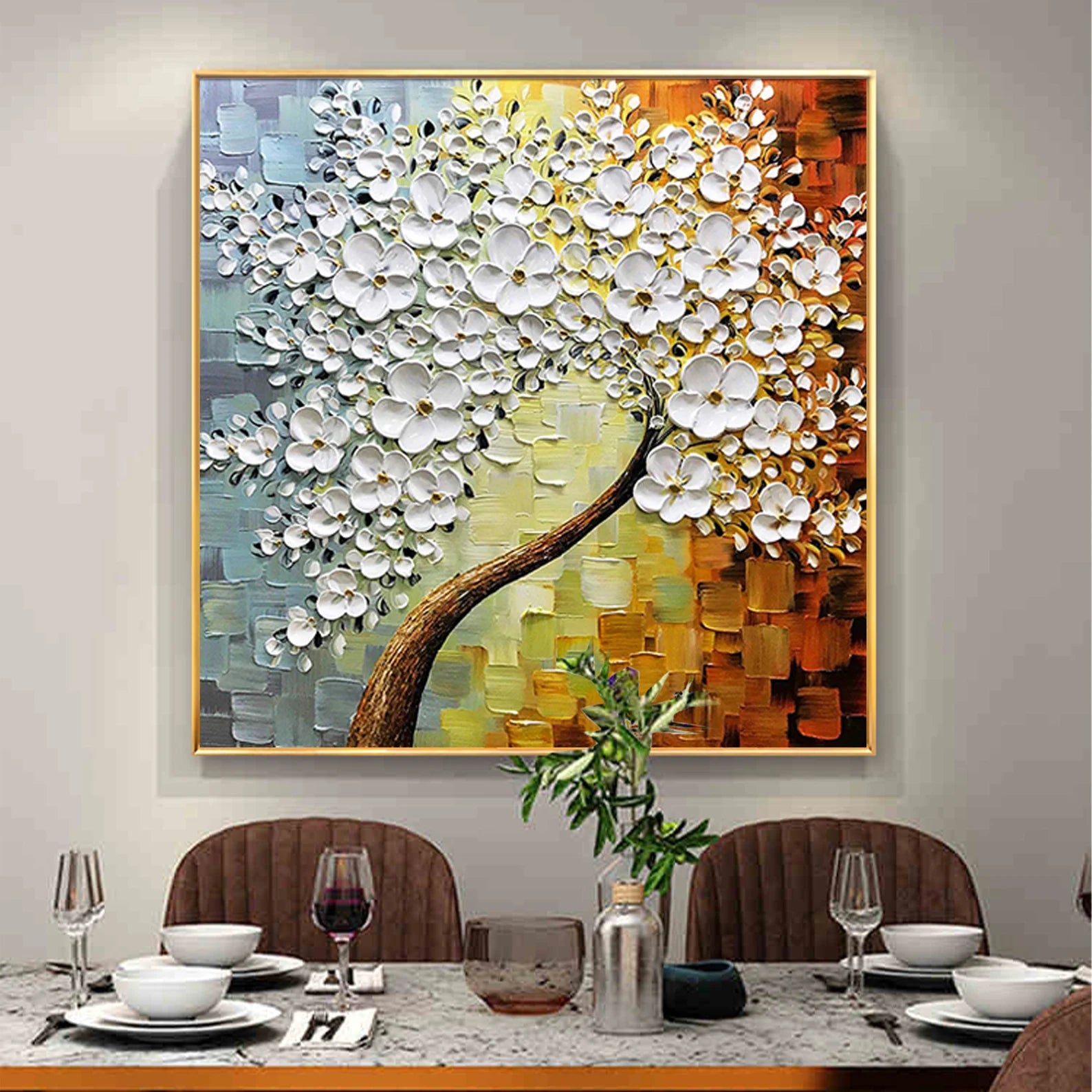 Dieses wunderschöne Ölgemälde wird Ihr Zuhause in einem neuen Gewand erscheinen lassen. Durch den 3D Effekt, wird sich das Bild ideal in Ihren Raum integrieren. Die weissen Blüten heben sich etwas von dem Bild ab, was zu dem genannten Effekt führt.