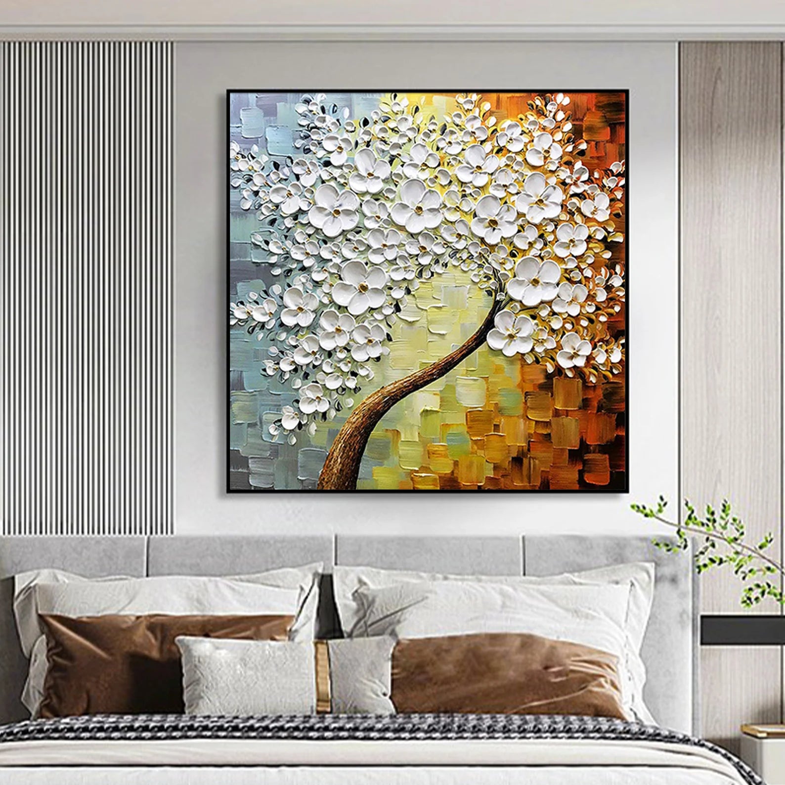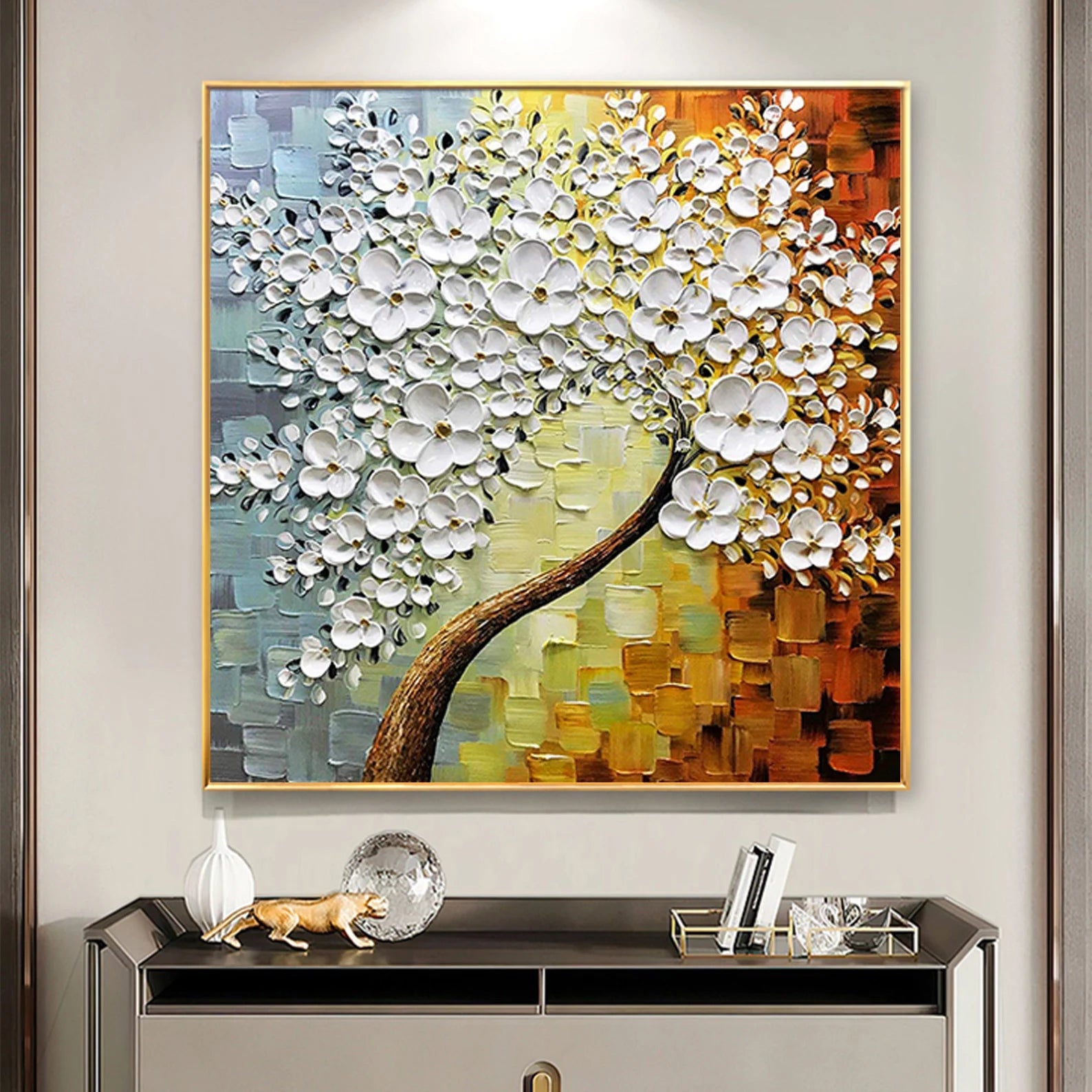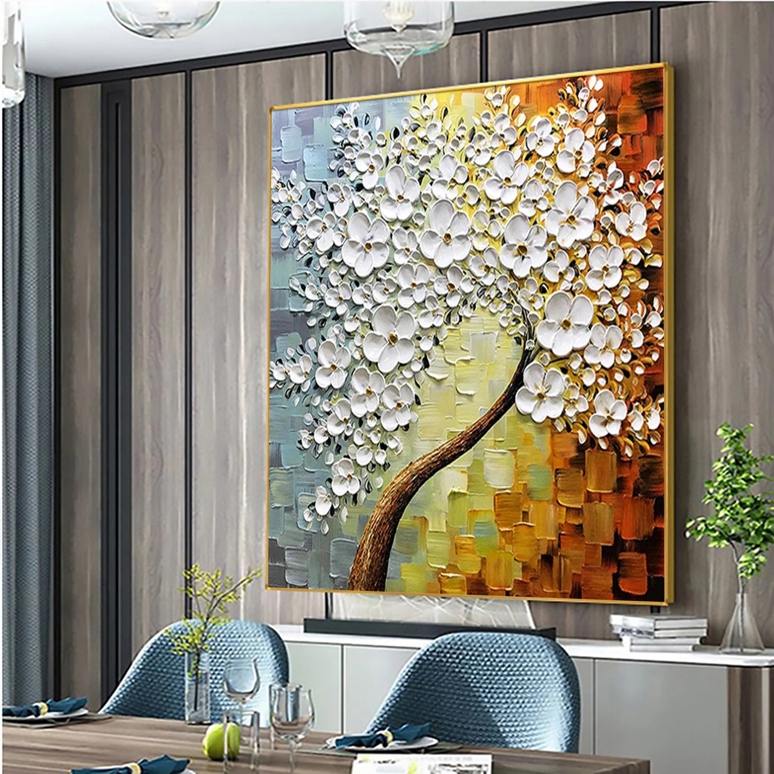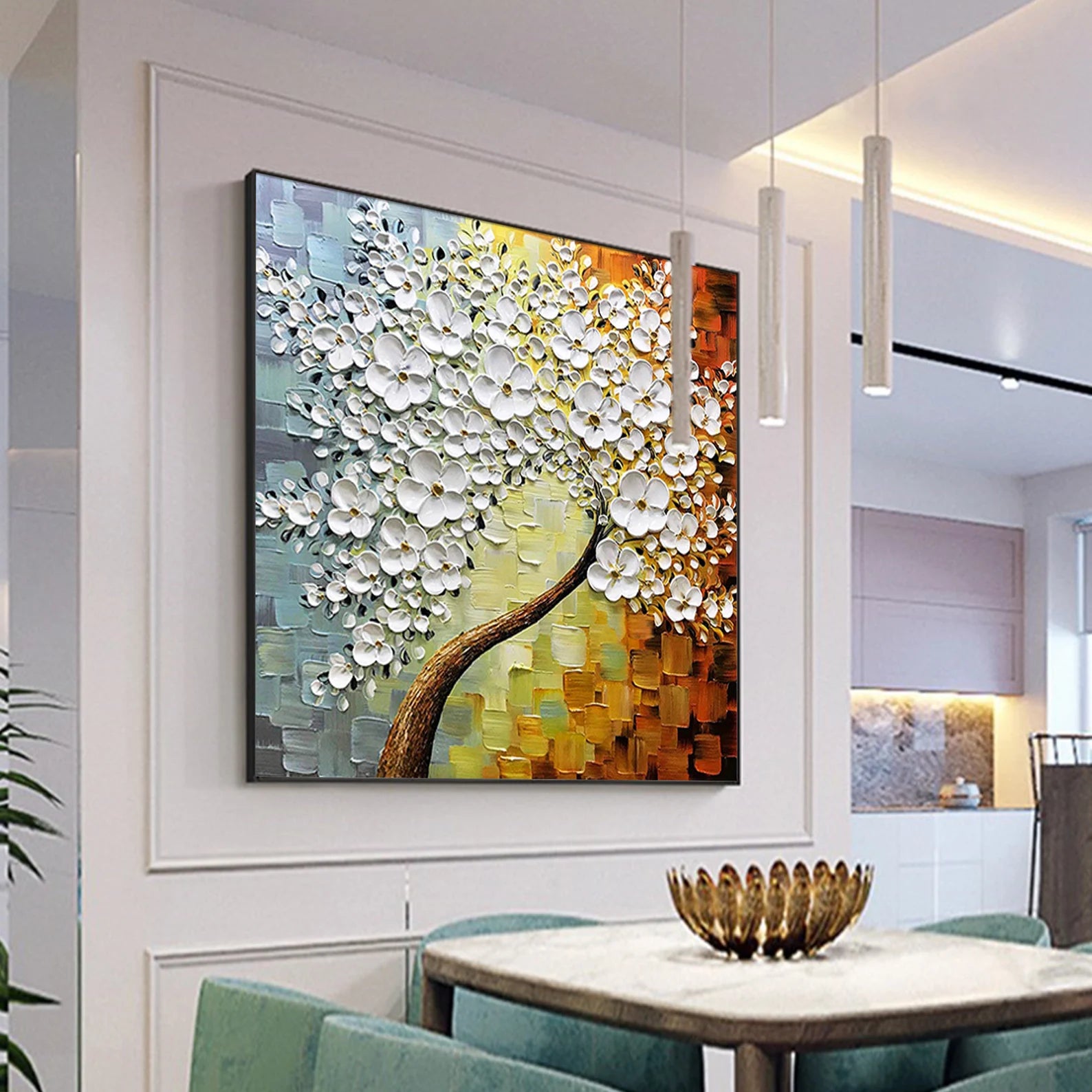 Dieses wunderschöne Ölgemälde wird Ihr Zuhause in einem neuen Gewand erscheinen lassen. Durch den 3D Effekt, wird sich das Bild ideal in Ihren Raum integrieren. Die weissen Blüten heben sich etwas von dem Bild ab, was zu dem genannten Effekt führt.