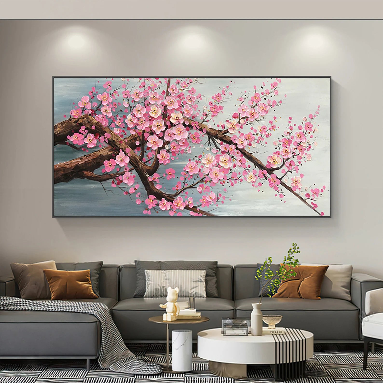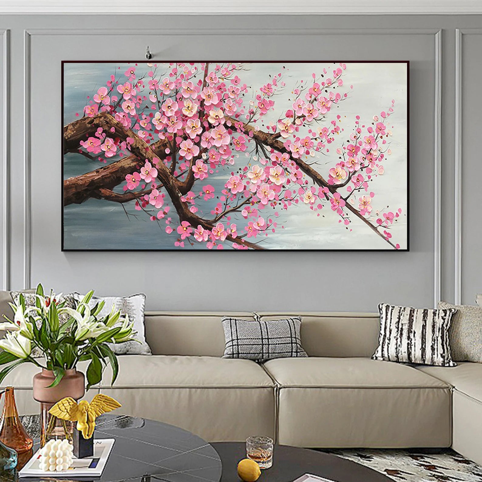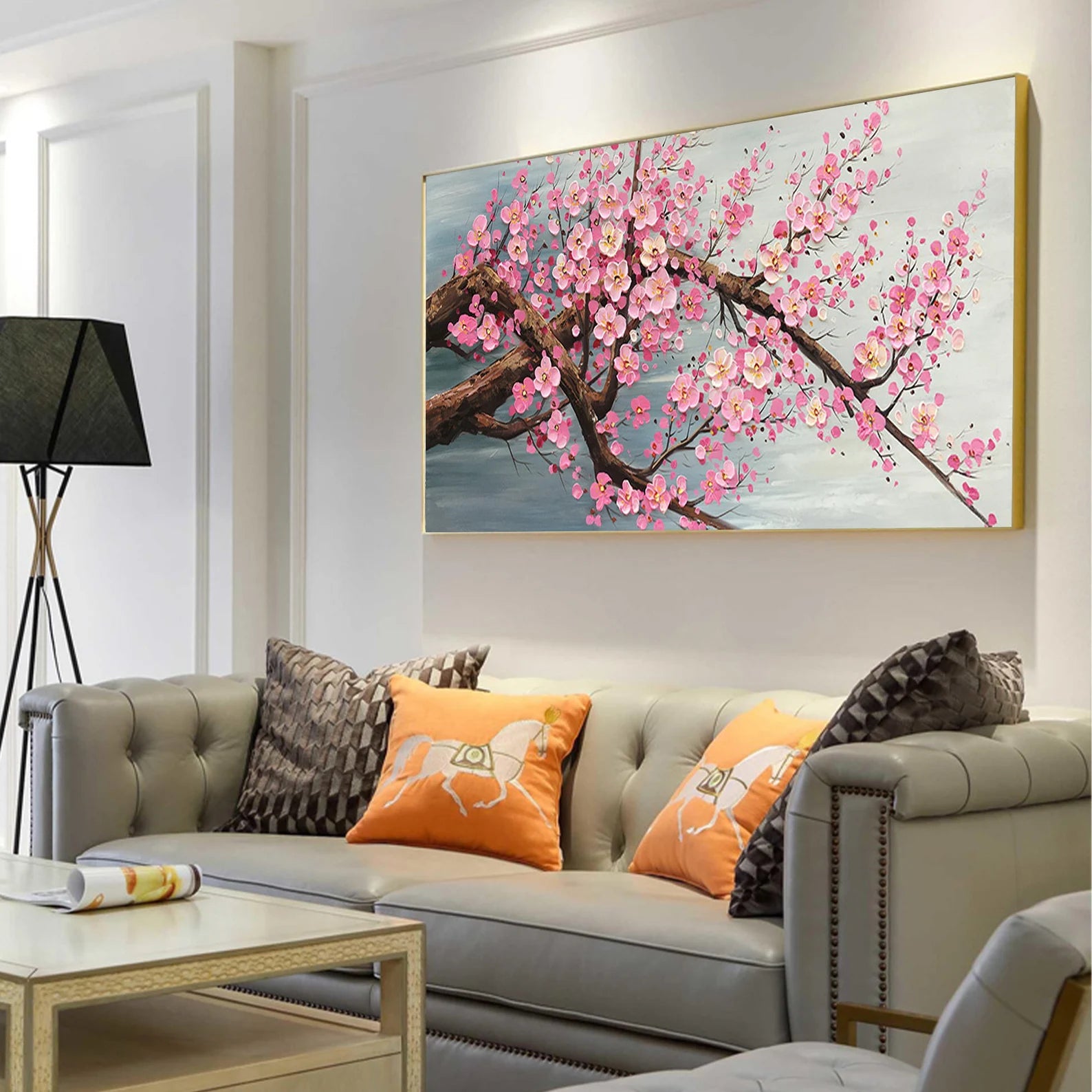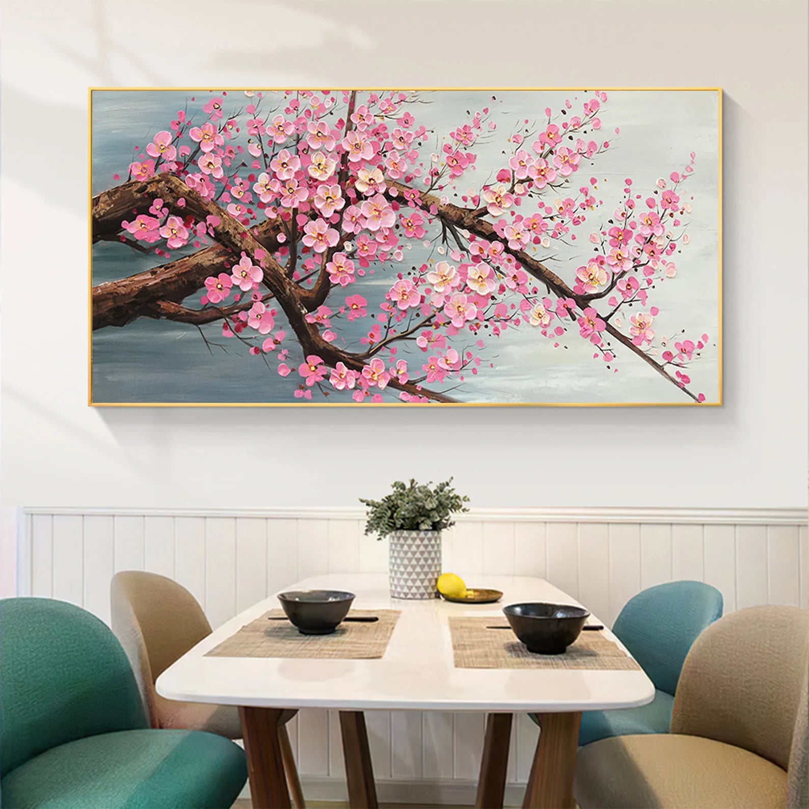 Dieses wunderschöne Ölgemälde wird Ihr Zuhause in einem neuen Gewand erscheinen lassen. Durch den 3D Effekt, wird sich das Bild ideal in Ihren Raum integrieren. Die pinken Blüten heben sich etwas von dem Bild ab, was zu dem genannten Effekt führt.