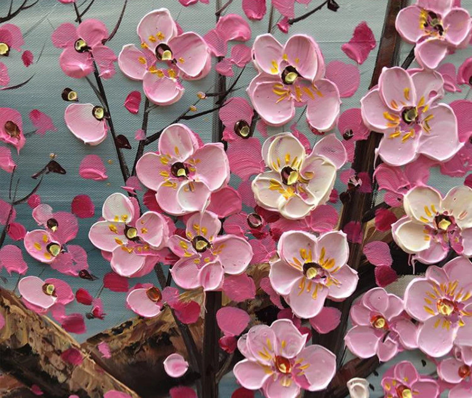 Kirschblüten Rosa auf Ast Ölgemälde Handmade